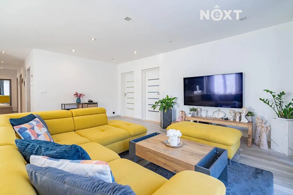 Dům má zastavěnou plochu 216 m². Po vstupu se nachází zádveří se samostatnou šatnou, odkud vede vstup do velmi prostorného obývacího pokoje s velkými francouzskými okny orientovanými do zahrady. Obývací pokoj je propojen s kuchyní, která nabízí dostatek úložného prostoru, vestavnou myčku, elektrickou troubu, mikrovlnnou troubu, indukční varnou desku i lednici. Celý interiér působí vzdušně, je plný přirozeného světla a nabízí příjemnou domácí atmosféru. Z obývacího pokoje lze vstoupit do dětského pokoje.