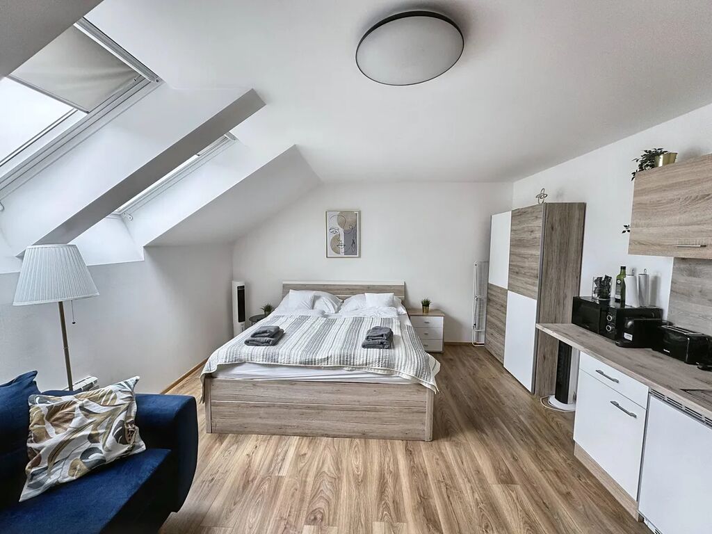 Exkluzivní podkrovní byt 1+kk v citlivě zrekonstruovaném činžovním domě v srdci Prahy.