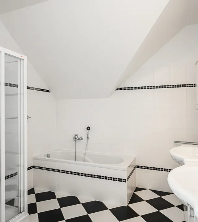 V podkroví se nachází čtyři prostorné ložnice o výměrách 39 m², 24 m², 26 m² a 26 m² ,dále chodba o velikosti 15 m² koupelna o rozloze 12 m² vybavená dvěma umyvadly, vanou a sprchovým koutem a samostatná toaleta s bidetem o ploše 3 m².