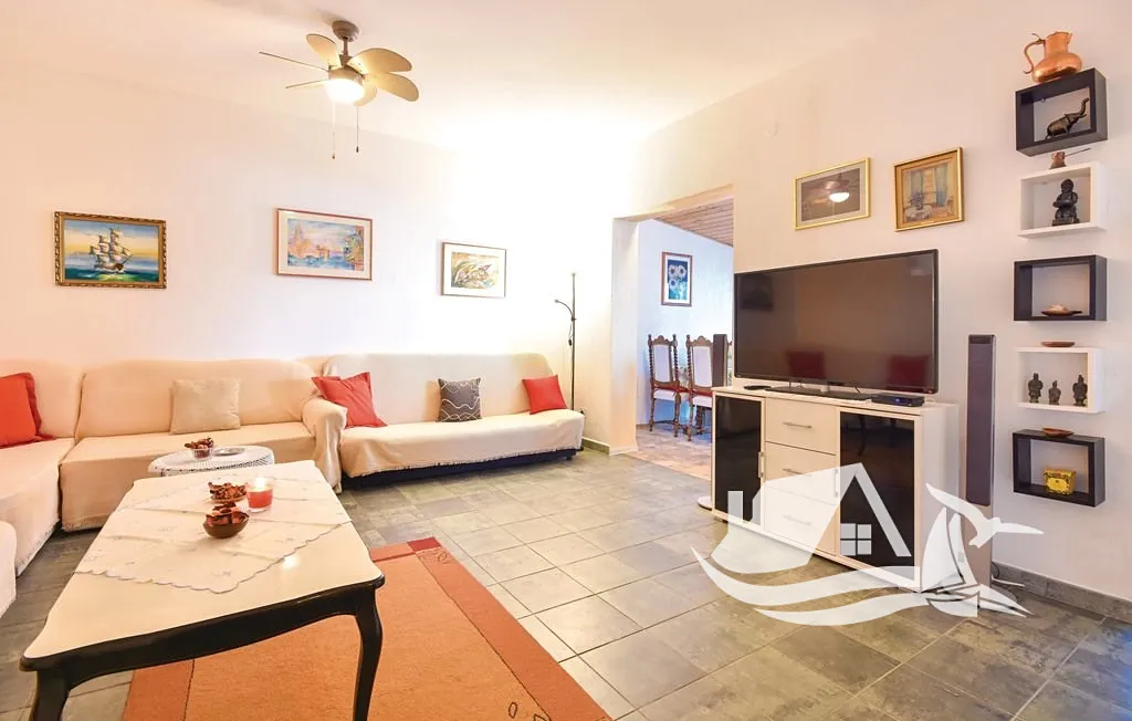 Vnitřní prostory jsou rozdělené prakticky. Přízemí slouží jako garáž, sklad a rekreační část, první patro tvoří obytnou zónu s velkou terasou a druhé patro nabízí čtyři pokoje, z nichž většina má výhled na moře. Dům je pravidelně udržovaný, postavený poctivě a rozšiřovaný s ohledem na funkčnost.
