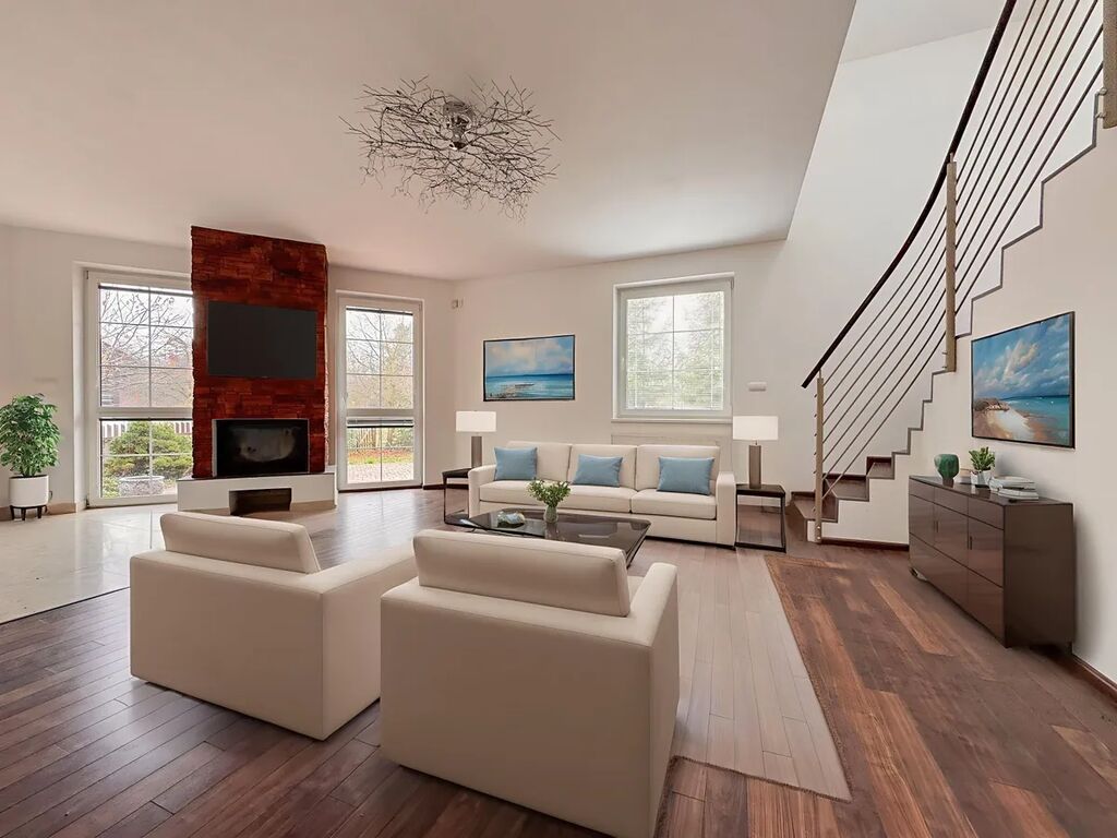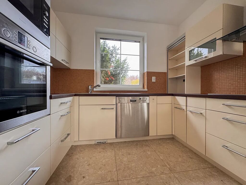 • přízemí: světlá vstupní chodba s přímým vstupem do garáže, prostorný obývací pokoj s krbem a kuchyňským koutem (cca 41 m²) se vstupem na terasu a zahradu, plně vybavená kuchyně (myčka, trouba, varná deska, mikrovlnná trouba, digestoř, americká lednice, dřez), koupelna s vanou, samostatné WC, vstup do sklepa a garáže