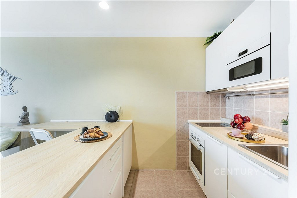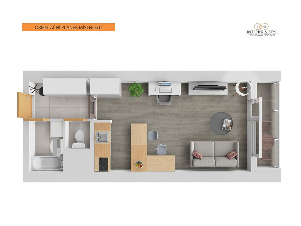 Obývací pokoj myslí i na práci z domova a je rozčleněn na pracovní, odpočinkovou a jídelní část. Navazující kuchyňský kout s velkorysou pracovní plochou a úložnými prostory strčí kuchyně běžných 1+kk hravě do kapsy. Kromě všech běžných spotřebičů včetně myčky nádobí se pyšní i elegantně vestavěnou mikrovlnkou.