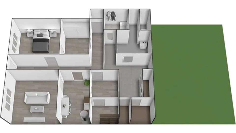 Vstupními dveřmi vejdeme do prostorné chodby o celkové ploše cca 14,2 m2, která propojuje hlavní obytné části domu. Po levé straně se nachází pokoj o výměře cca 16,42 m2, který může sloužit jako obývací pokoj či ložnice. Z tohoto pokoje je vstup do další místnosti o ploše cca 10,11 m2, vhodné jako ložnice, dětský pokoj, šatna nebo pracovna. Z již zmíněné chodby je dále přístup do kuchyně o rozloze cca 9,64 m2, kde je zároveň umístěn ohřev teplé vody. Z kuchyně vejdeme do prostorného pokoje o velikosti cca 22,47 m2, který lze využít jako hlavní obývací pokoj či další ložnici. Z kuchyně je také přístup do menší místnosti o celkové ploše cca 8,03 m2, jež může sloužit jako samostatná jídelna. Z této místnosti je vstup do komory o celkové ploše cca 4,34 m2 a zároveň je z ní možné projít zpět do hlavní chodby, což vytváří praktické dispoziční propojení. Chodba pokračuje ke koupelně o celkové ploše cca 4,2 m2 a samostatnému WC o celkové ploše cca 1,08 m2. Z chodby je vstup na soukromý dvůr, odkud se vchází do jednotlivých nebytových prostor. Z dvoru je přístup na půdu nad domem o výměře cca 68,52m2, která přímo vybízí k půdní nástavbě. Nachází se zde komora o rozloze cca 7,55 m2, ze které vedou schody do sklepa o celkové ploše cca 5,76 m2. Na dvoře jsou dále tři menší nebytové prostory o celkových plochách cca 5,13 m2, 4,78 m2 a 2,59 m2.