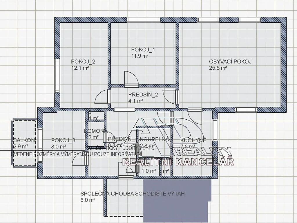 Celková plocha bytu 90m2, podlahová plocha bytu [84,6m2] + balkon [2,3m2] + větší sklep [3,0m2].