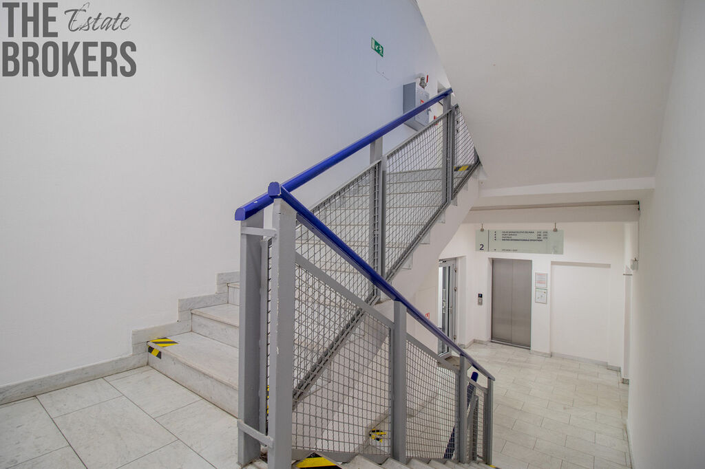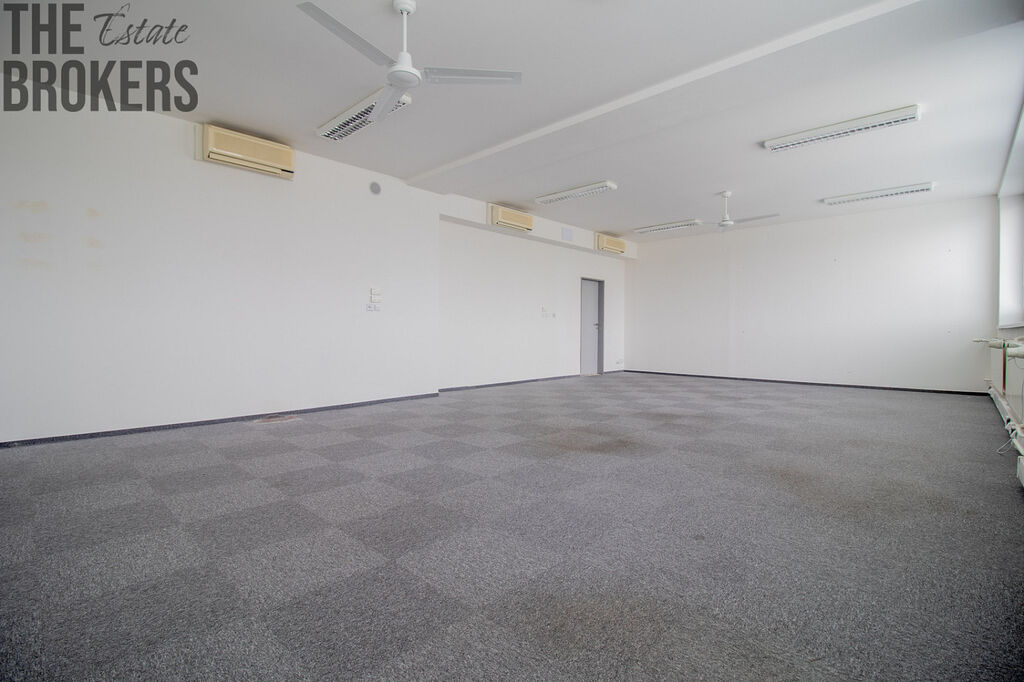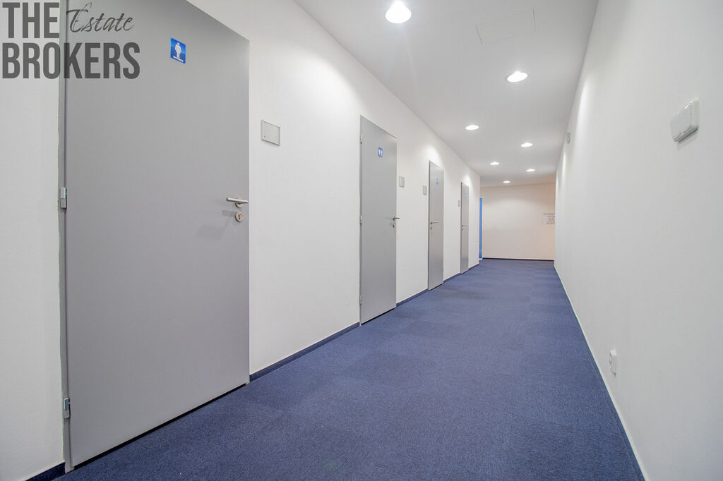 Kancelář o 59,15 m² je příjemně prosvětlená, vybavená kobercem a klimatizací a má plně bezbariérový přístup včetně výtahu. Na patře jsou k dispozici dámské i pánské toalety, ve vrchním patře navíc společná kuchyňka.