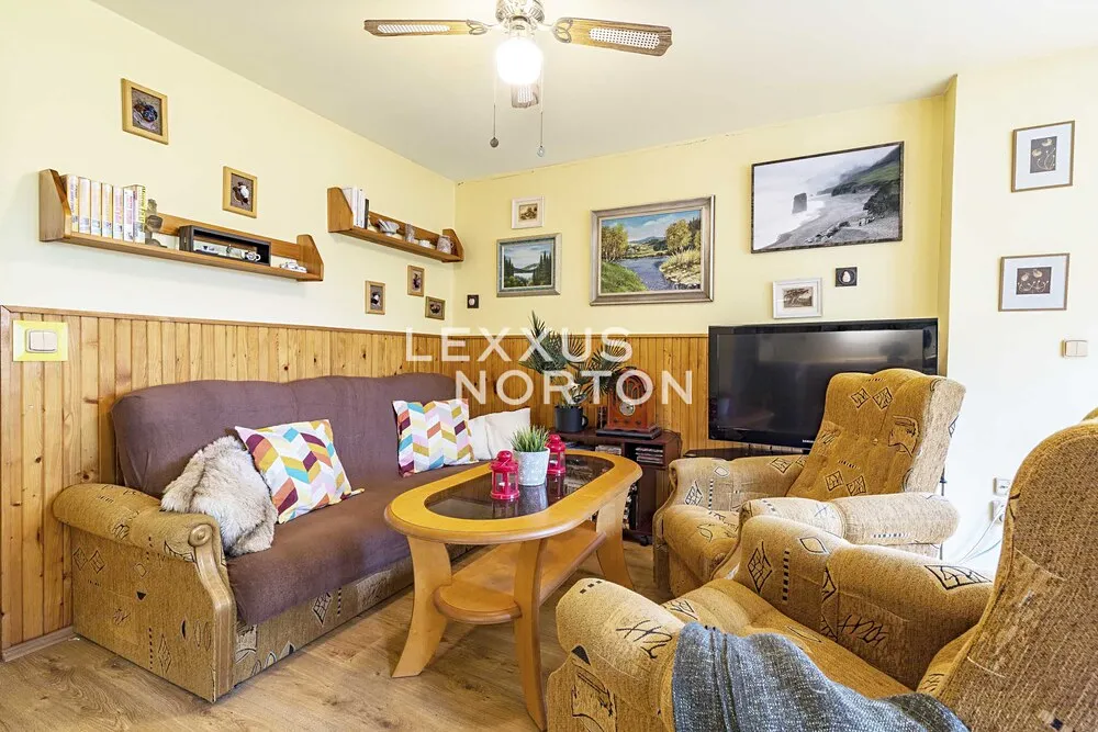 Na pozemku o velikosti 290 m² stojí chata s užitnou plochou cca 100 m², garáž (30 m²) využívaná jako dílna a sklad, a terasa nad garáží o stejné velikosti – ideální místo pro letní stolování nebo klidné ráno s výhledem do zeleně.