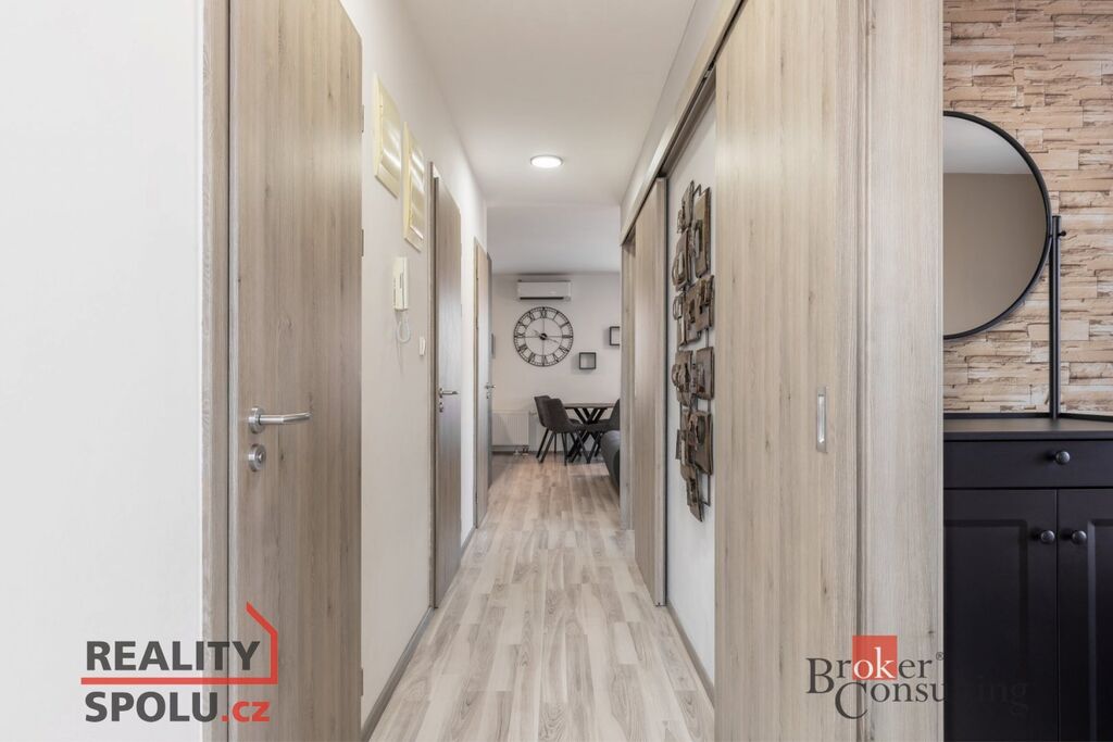 Byt má okna na tři světové strany, vlastníci tedy benefitují z výborného denního světla. Vstupní předsíň má vlastní velkoformátové okno a dostatek prostoru na převlékání, přezouvání nebo zaparkování kočárku. Je zde velká vestavná skříň pro vše nezbytné.