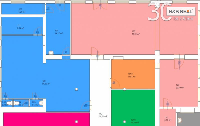 Prostor je dispozičně rozdělen na několik místností o různé velikosti (viz půdorys - modré a oranžové místnosti). V posledních letech byly prostory využívány pro obchodní činnost, pro mimoškolní aktivity dětí, ale také např. jako čajovna, kavárna. Pro tyto účely byl interiér postupně renovován a zařízen. Součástí pronájmu je mj. barový pult a skříňky a kuchyňská linka (viz fotografie).