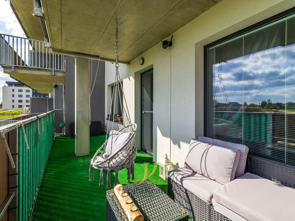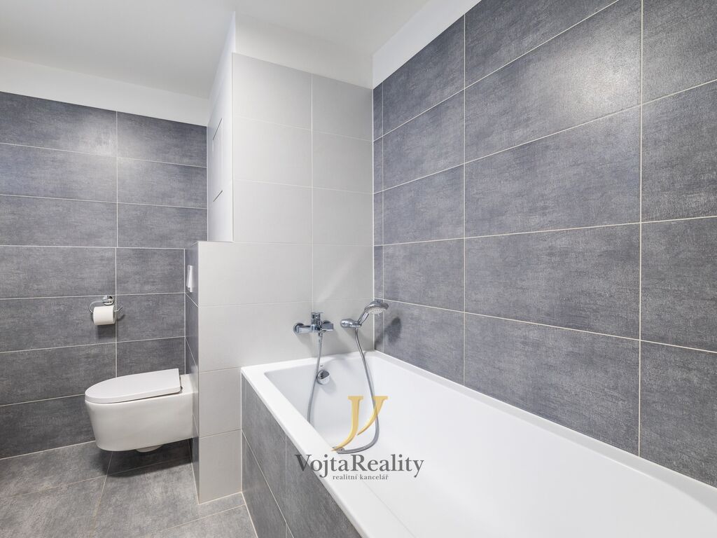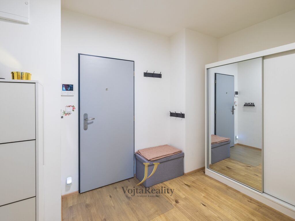 Dispozice bytové jednotky nabízí vstupní chodbu, obývací pokoj s kuchyňským koutem, ložnici a koupelnu. Kuchyňská linka byla zhotovena na míru a je vybavena vestavěnými spotřebiči, mezi které patří myčka nádobí, mikrovlnná trouba, elektrická trouba, varná indukční deska, digestoř, lednice s mrazicím boxem a dřez. Ložnice, stejně jako obývací pokoj má vstup na terasu. Koupelna je vybavena vanou, umyvadlem se skříňkou, přípojkou na pračku, elektrickým topným žebříkem a toaletou. Součástí bytové jednotky je i prostorná terasa s výměrou 15m² a komora. Možnost přenechání venkovního parkovacího stání za poplatek 1500,-/měsíc.