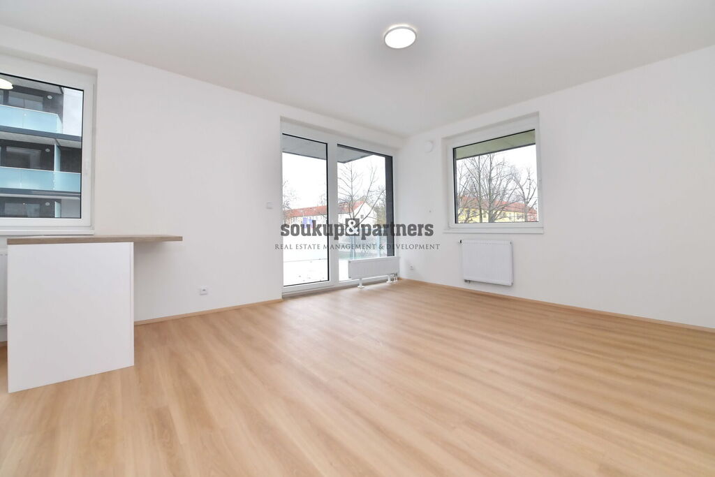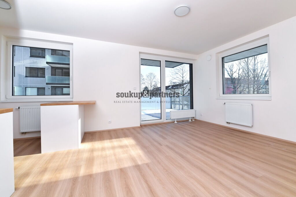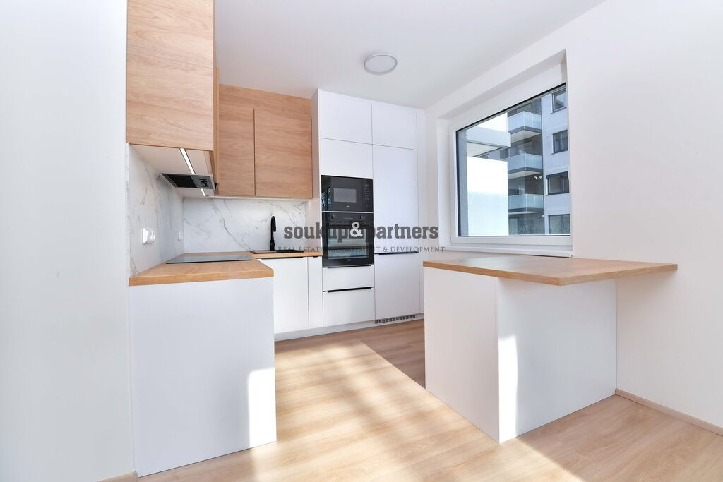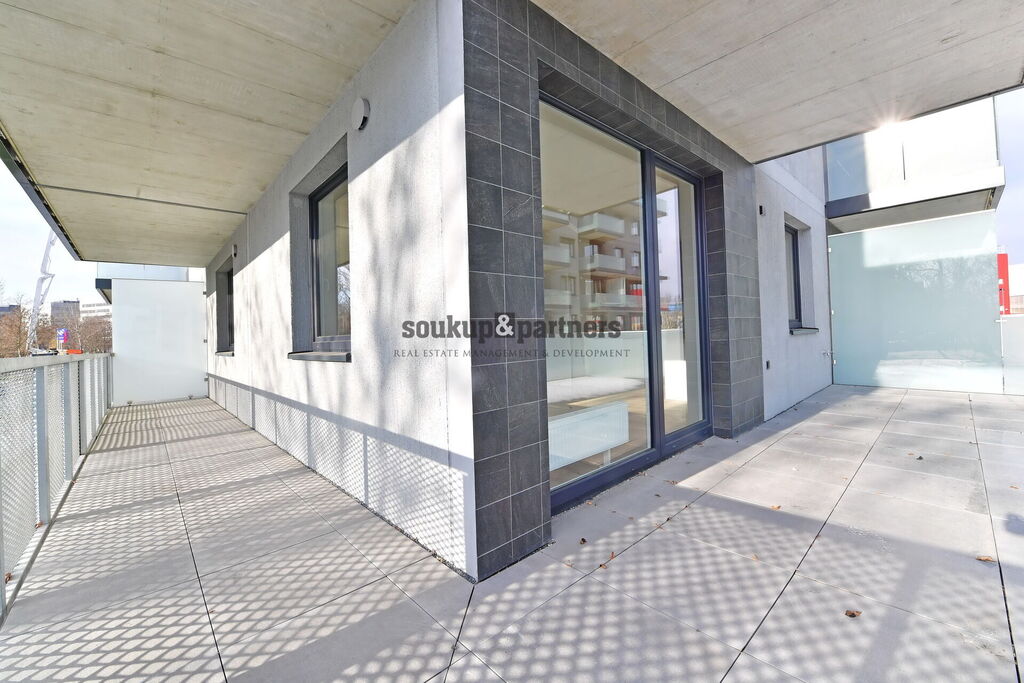 Pronájem bytu 2+kk o výměře 52,8 m² + terasa (49,8 m²) + sklep (4,8 m2) + garážové stání, který se nachází v 1. nadzemním podlaží novostavby v projektu Nad Krocínkou, Praha 9 - Prosek.