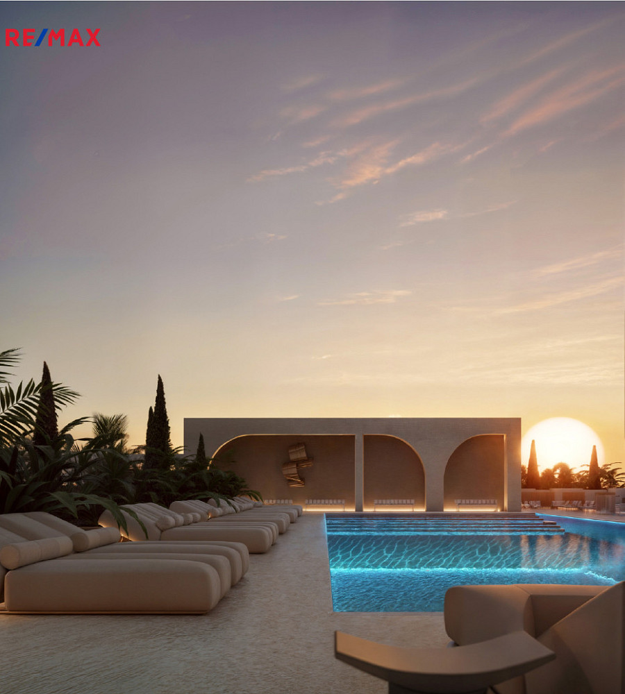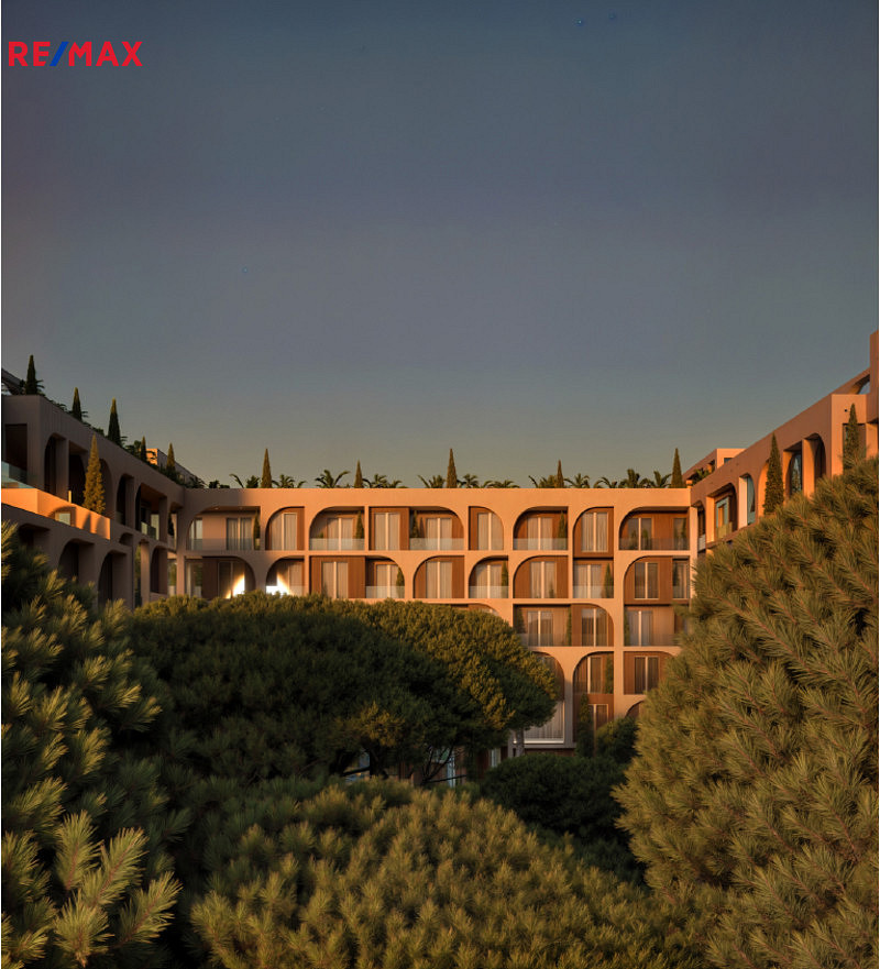Resort je zasazený mezi vzrostlé borovice typické pro tuto část pobřeží. Dominantním prvkem jsou elegantní obloukové linie fasád, velké prosklené plochy a množství zeleně kolem celého areálu. Architektura kombinuje středomořský styl s moderním bydlením – přesně to, co dnes turisté i kupující hledají.