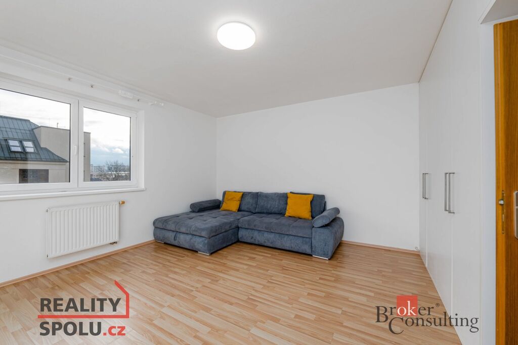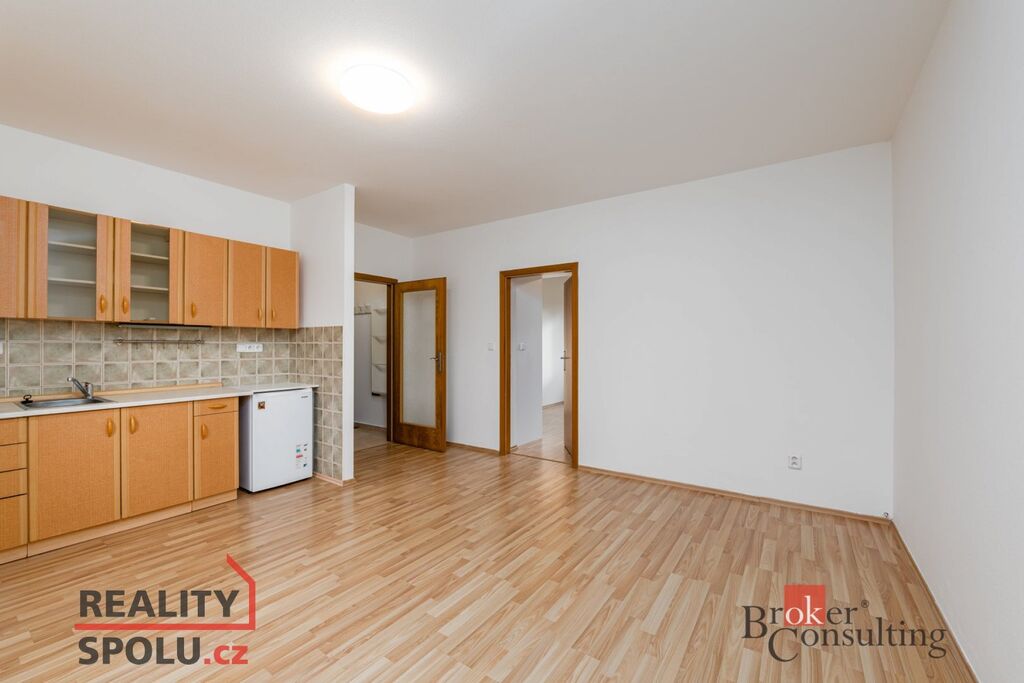 Dispozice zahrnuje chodbu, koupelnu s WC, obývací pokoj s kuchyňským koutem a ložnici. Velkou výhodou je prostorná vestavěná skříň v ložnici a gauč, který je součástí vybavení. Byt je ve velmi dobrém stavu, působí čistě a vzdušně.