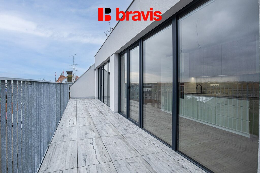 Z obývací části je přímý vstup na terasu, která nabízí orientaci na areál Nové Zbrojovky – ideální místo pro ranní kávu nebo večerní posezení.