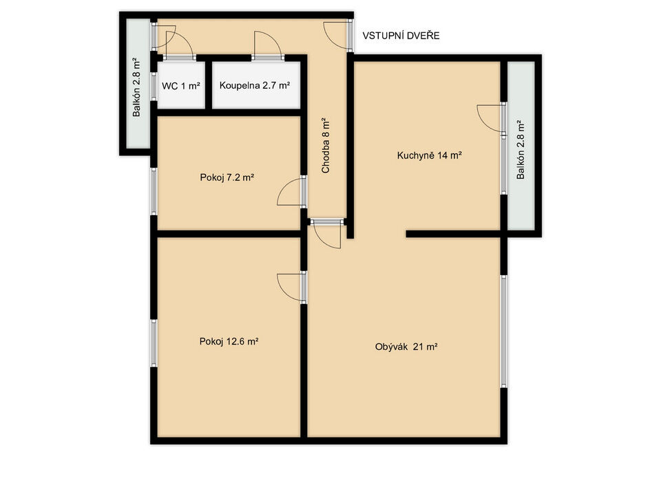 • Dispozice: Dvě samostatné ložnice, obývací pokoj s průchodem do kuchyně, předsíň, koupelna a oddělené WC, nadstandardní sklep a dva balkony.