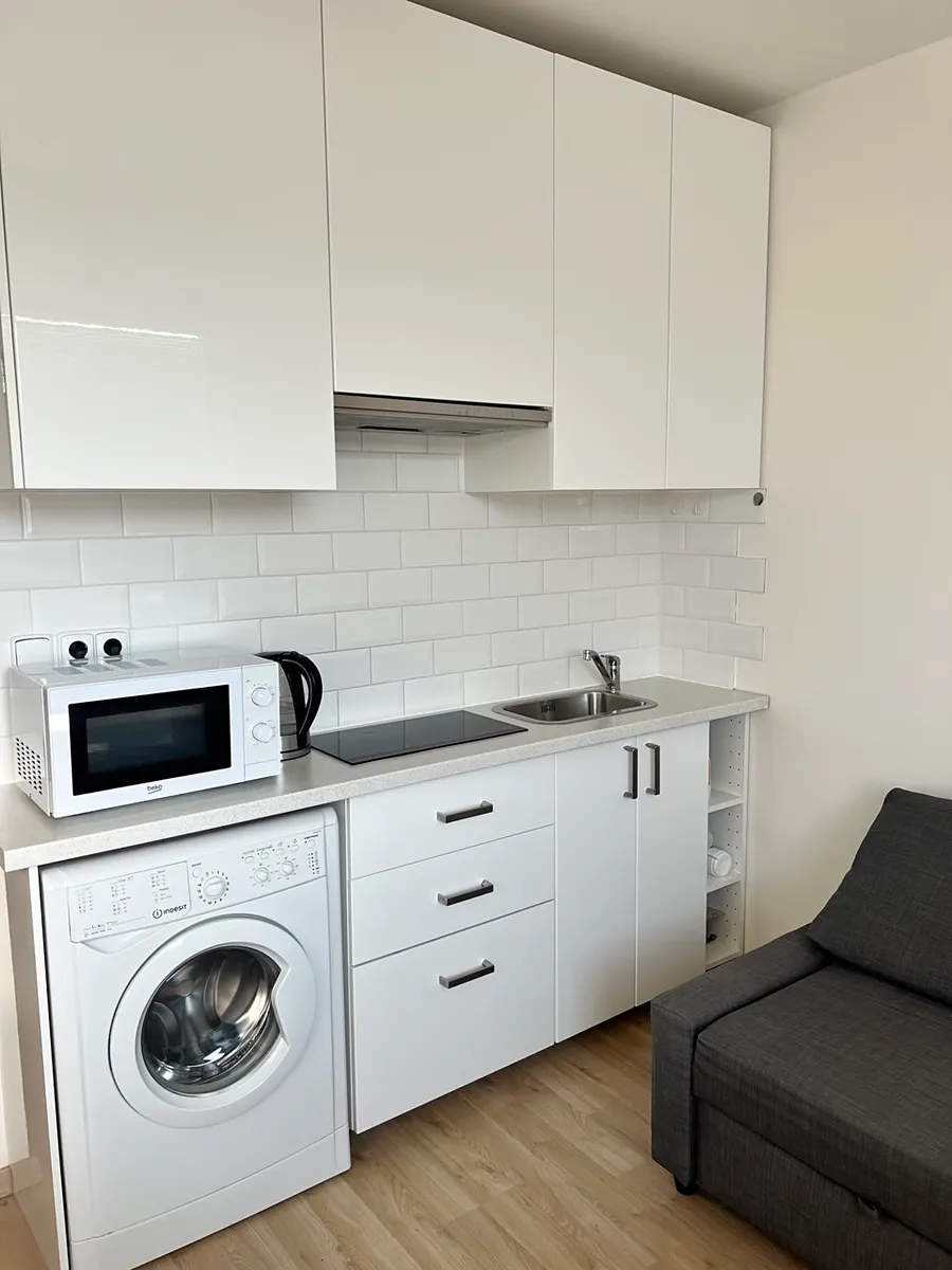 Jednotka vybavená. Kuchyňský kout je vybaven indukční plotýnkou, mikrovlnkou a lednicí. Ve vstupní chodbě se nachází vešak a botnik.