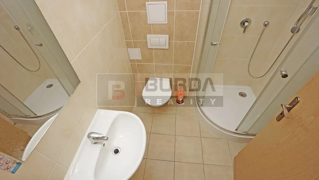 Koupelna je vybavena sprchovým koutem, topným žebříkem, zavěšeným WC, umyvadlem a zrcadlem.