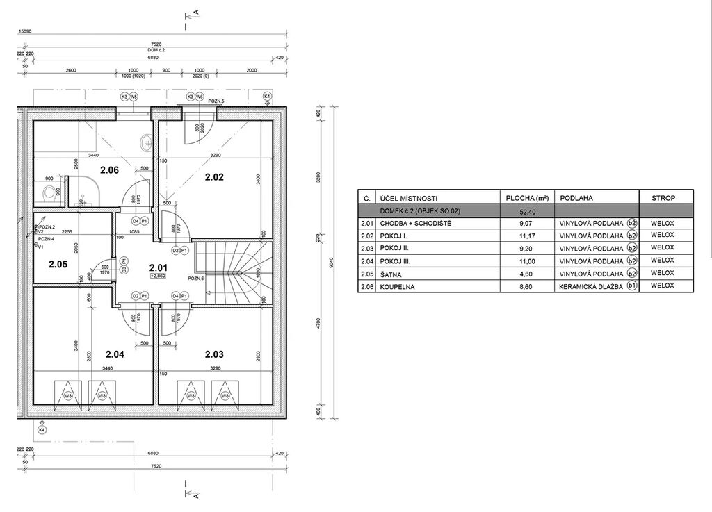 V podkroví najdeme tři pokoje, šatnu a koupelnu se sprchovým koutem, vanou a wc. Všechny místnosti jsou neprůchozí.