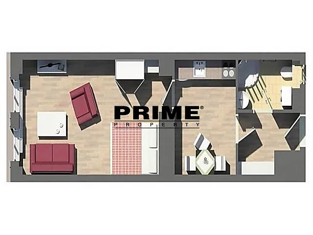 Dispozice bytu: vstupní předsíň, průchozí kuchyň s plně vybavenou kuchyňskou linkou se spotřebiči (sklokeramická varná deska, trouba, lednice s mrazákem, myčka, mikrovlnná trouba plus rychlovarná konvice, kávovar, toaster a nádobí), hlavní místnost (obývací část kombinovaná s částí na spaní) a koupelna (se sprchovým koutem, umyvadlem, toaletou a pračkou se sušičkou).