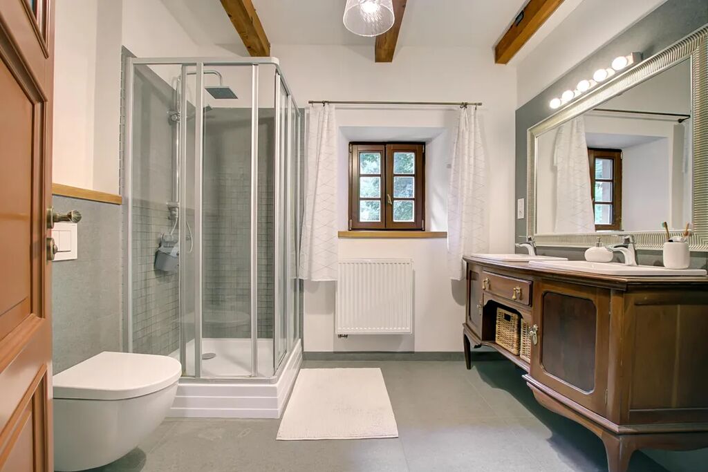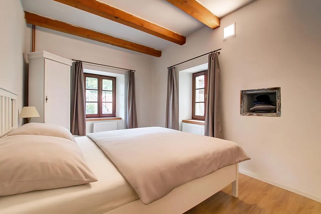 K dispozici jsou celkem 3 ložnice, půda, světlý obývací prostor s kuchyňským koutem, moderní koupelna s WC, velký prostor v přízemí s přípravou pro kuchyň, 3x WC, technické zázemí a dostatek úložných prostor. Interiér doplňují dřevěné trámy, stylové dveře a dostatek přirozeného světla díky střešním i klasickým oknům.