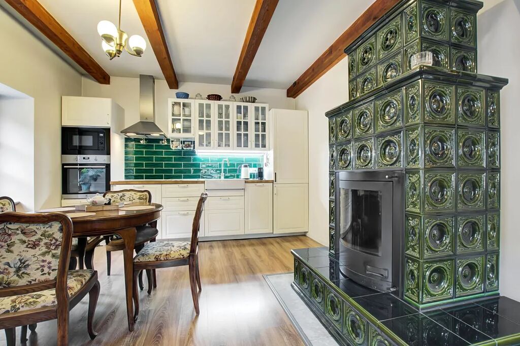 Dům na třech podlažích nabízí útulný interiér s důrazem na detaily, dřevěné podlahy, kvalitní keramiku a prvky zachovávající dobový charakter.