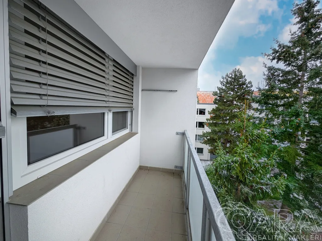 Z lodžie (4,1 m²) je příjemný výhled, který díky umístění v nejvyšším patře nabízí dostatek denního světla. Dům samotný prošel rekonstrukcí – má novou zateplenou fasádu, opravené balkony a jsou zde instalovány předokenní rolety, což přispívá k nízkým provozním nákladům i lepšímu komfortu bydlení.