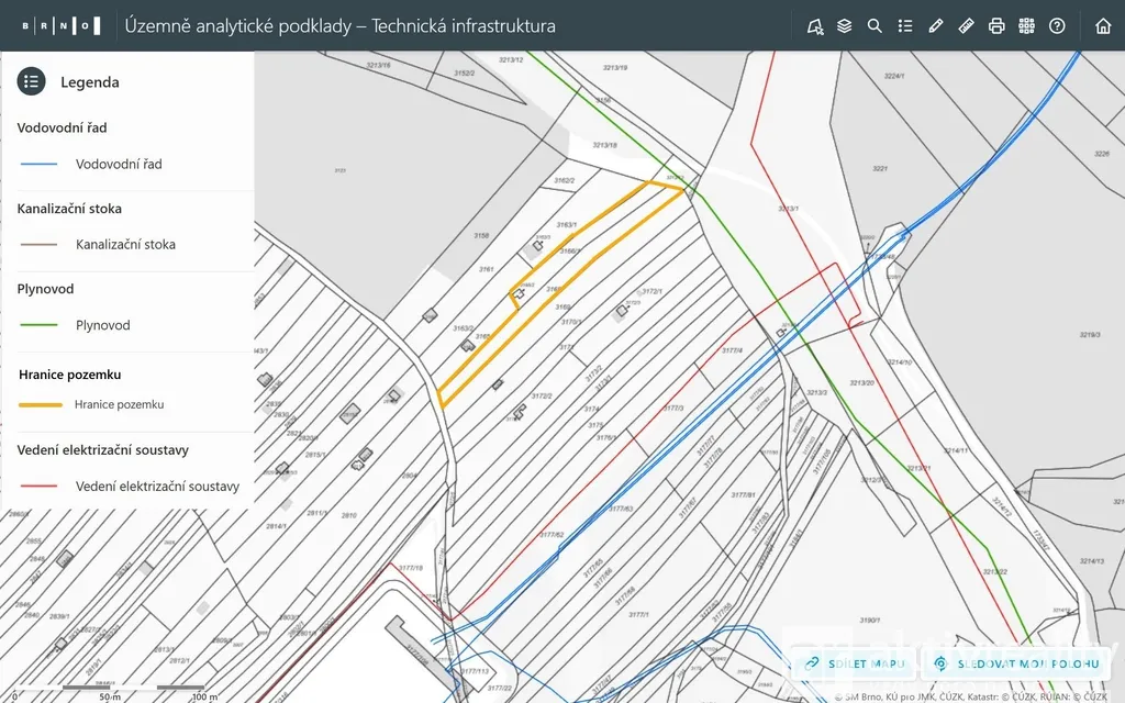 Telekomunikační kabel 1000 Mbps zatím končí v ulici Jámy, 429 m od pozemku, bezdrát v lokalitě dovolí 70 Mbps.