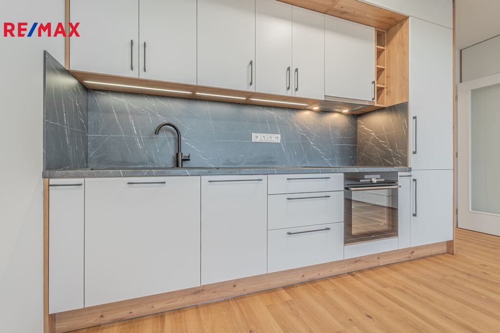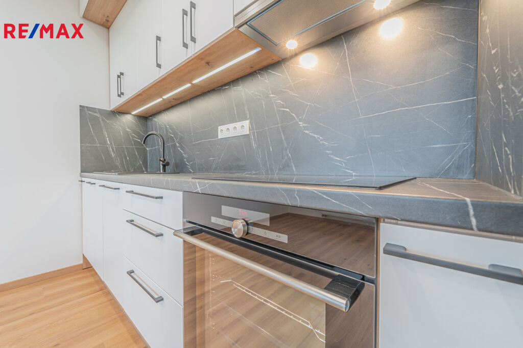 Byt je k pronájmu částečně vybavený nábytkem a elektrospotřebiči, jak můžete vidět na fotografiích – k dispozici je kuchyňská linka, lednice s mrazákem, varná deska, trouba, myčka, pračka a také komfortní šatní skříně u vstupu i v obývacím pokoji.