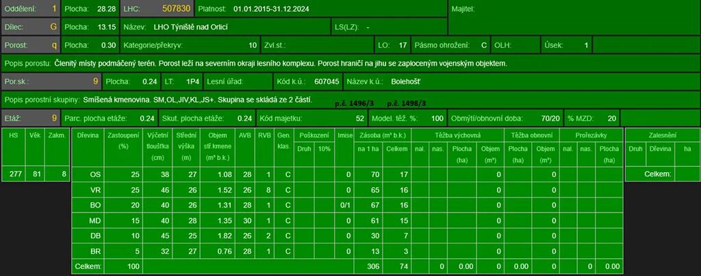 - p.č. 1498/3 vedená jako lesní pozemek o celkové výměře 534 m2 (stáří lesa 91 let - zastoupení dřevin topol, vrba, borovice, modřín, dub, bříza).