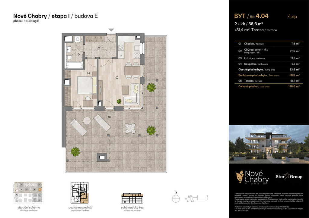 Hledáte domov, kde se propojuje klid, soukromí a kompletní zázemí pro pohodlný život? Tento byt 2+kk o velikosti 56,6 m² se nachází ve 4. podlaží komorního viladomu a nabízí vše, co potřebujete – prostorný interiér a rozlehlou střešní terasu o 81,4 m², kde si můžete užít chvíle odpočinku i pohody s přáteli.
