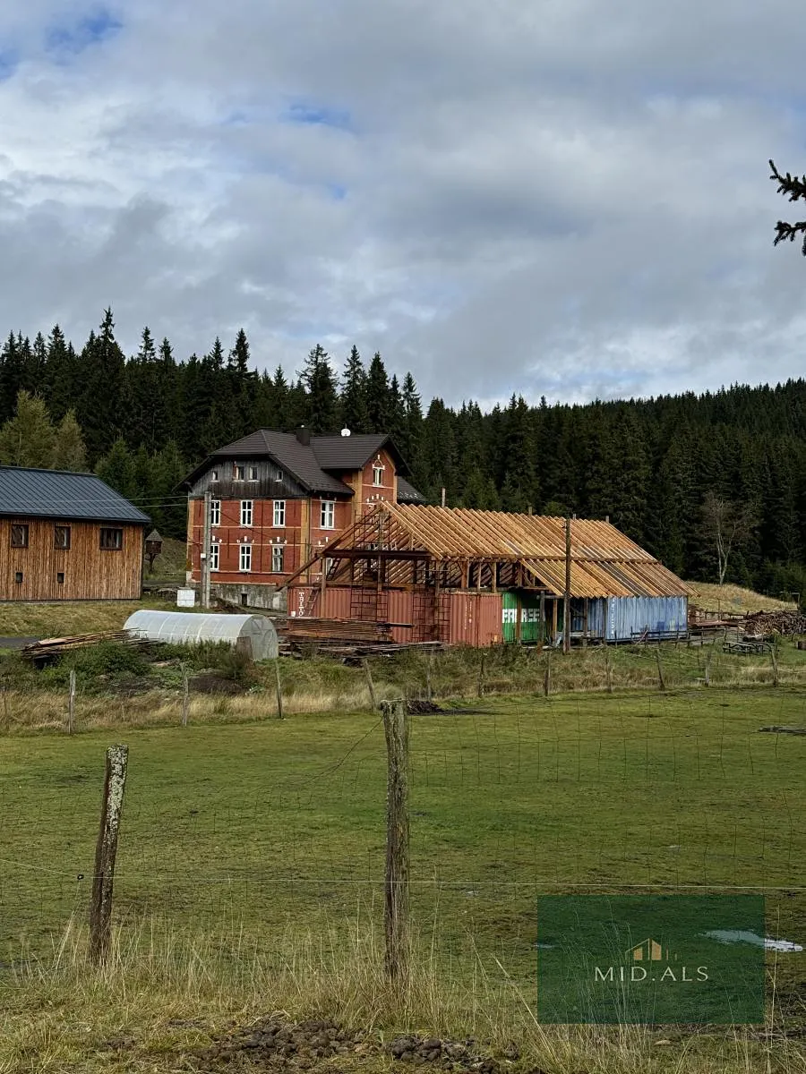 Nová rozestavěná budova: 300+ m vhodná pro stáje, dílnu, kurzy, nebo další ubytovací kapacitu.