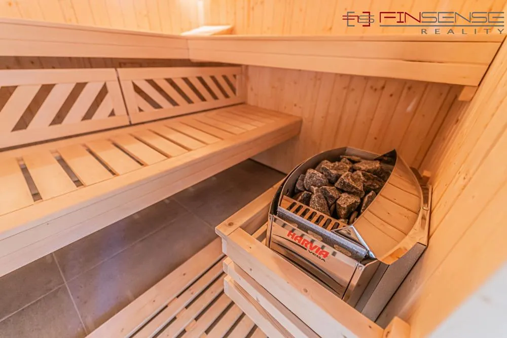 K bytu náleží společné prostory v přízemí domu, kde jsou sklepní kóje, kolárna/lyžárna a finská sauna s odpočívárnou. V ceně bytu je zahrnuté zastřešené parkovací stání. Zdroj pitné vody je ze studny a odpady jsou řešeny jímkou.