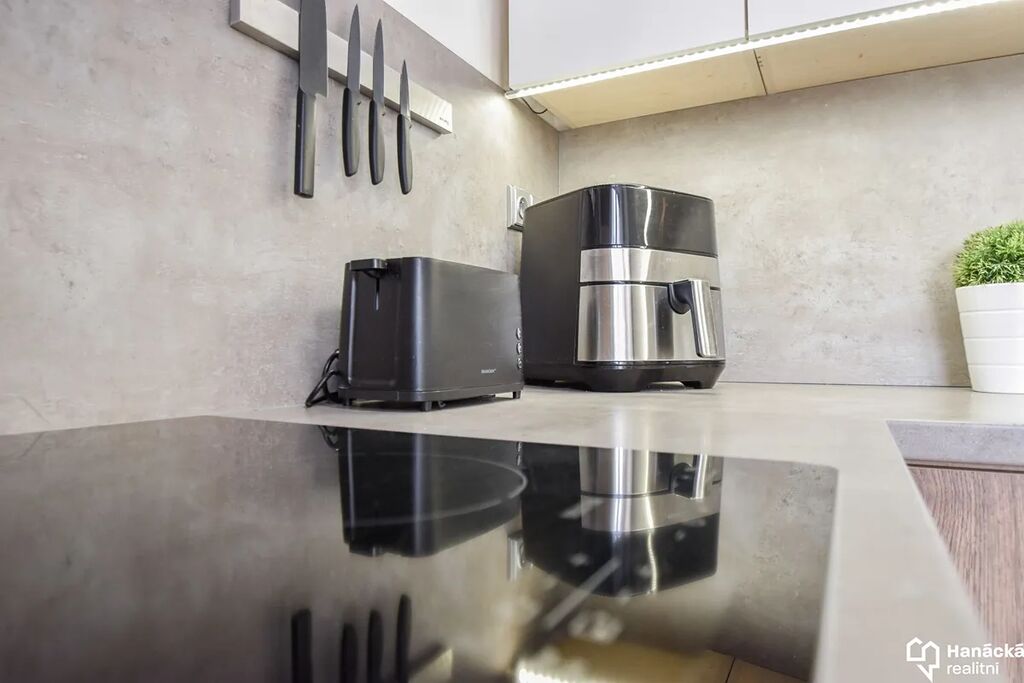 Součástí bytu je balkon orientovaný do klidného dvora, který nabízí příjemné soukromí. Interiér prošel rekonstrukcí a působí moderním, čistým a velmi dobře udržovaným dojmem. K dispozici je kompletně vybavená kuchyň se všemi spotřebiči a v bytě zůstává také pračka se sušičkou. Výhodou jsou i vestavěné šatní skříně, které poskytují dostatek úložného prostoru.