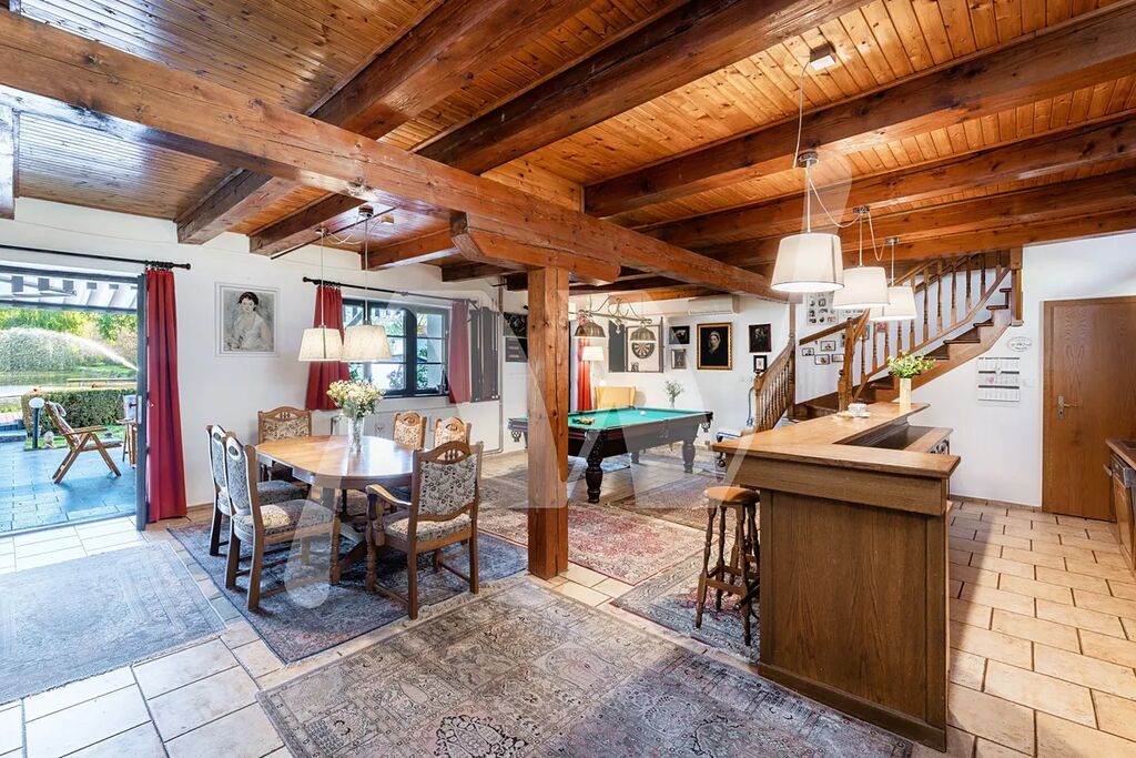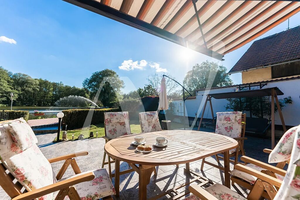 Dům disponuje velkorysým obývacím prostorem s kuchyní a barovým pultem, stylovými kachlovými kamny, kulečníkovým stolem a útulnou televizní místností. Navazující velká slunná z části zastřešená terasa je orientována do zahrady s výhledem na rybník a zeleň.