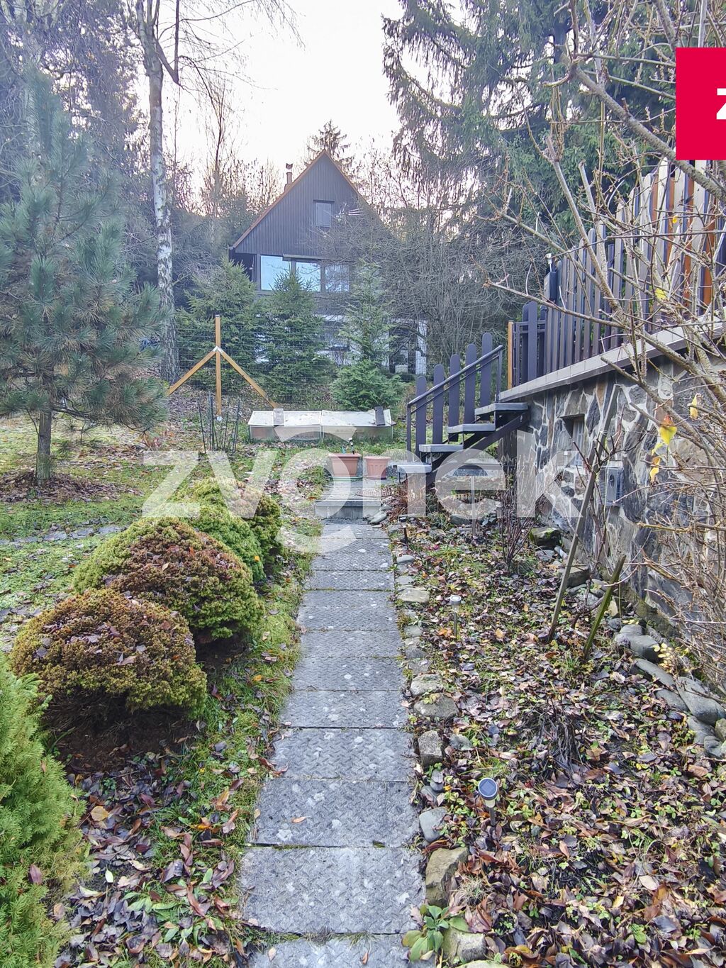 Pozemek: ovocné stromy, keře, okrasná zahrada