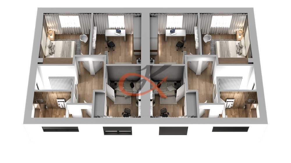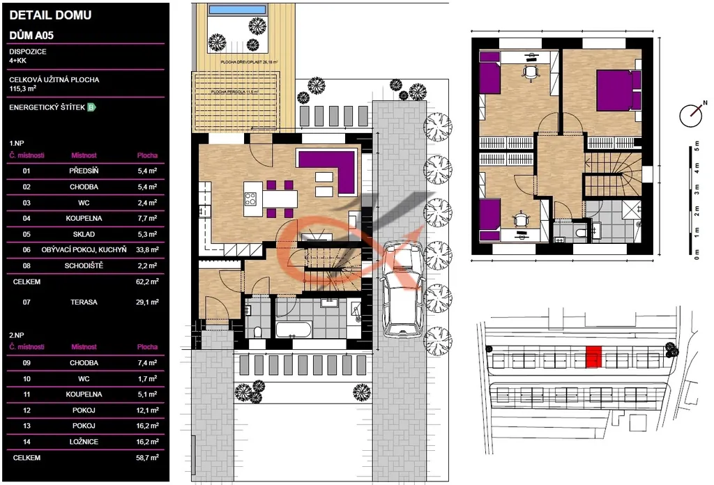 Prodej řadového rodinného domu o zastavěné ploše 84m2 s pozemkem včetně zastavěné plochy 195m2, RD 05. Jedná se o dvoupodlažní skeletový dům o dispozici 4+kk , celková užitná plocha 116,3m2. Dům je situován na ulici Holešovská v nově vznikající lokalitě. V první fázi bude postaveno jedenáct rodinným domů, následně výstavba dalších šesti domů. V přízemí domu se nachází vstupní chodba, centrální chodba se schodištěm do patra domu, koupelna s vanou, samostatná toaleta, obývací pokoj propojený s kuchyní o výměře 34,8m2, z obývacího pokoje je vstup na venkovní terasu, pod schodištěm je komora. V patře domu jsou tři prostorné pokoje, dva o velikosti 16m2 a jeden 12m2, koupelna se sprchovým koutem, samostatná toaleta, prostorná chodba. V domě bude elektrické podlahové vytápění, příprava pro instalaci krbových kamen a vývod pro externí komín. Střešní krytina - plechové šablony, okna plastová trojskla, podlahy linoleum, vnitřní dveře včetně obložek, bojler pro ohřev teplé vody, koupelny budou vybaveny obklady, dlažbou a veškerou sanitou. Příjezd k domu bude řešen zámkovou dlažbou, což umožní vznik parkovacích stání podél domu. Dům bude napojen na veřejný vodovodní řád a kanalizaci, přístup bude zajištěn z obecní komunikace. Dům se nachází přibližně 900m od centra Fryštáku a 8 km (cca 15 minut autem) od Zlína. Dům je ve výstavbě, jeho dokončení je plánováno v prvním kvartálu roku 2026.