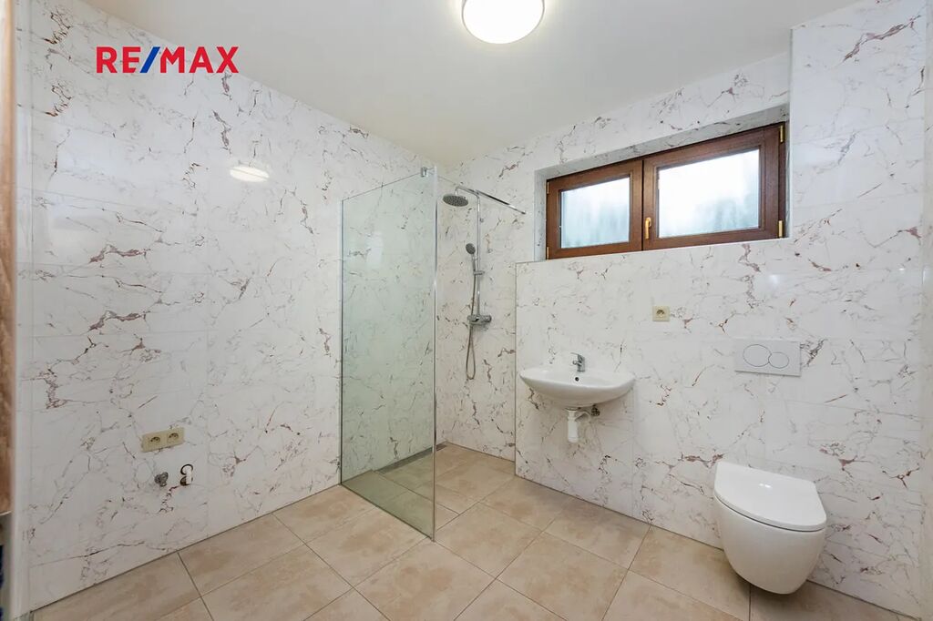 V prvním patře je obývací pokoj s kuchyňským koutem (včetně trouby, myčky a mikrovlnné trouby), komora, jeden samostatný pokoj, koupelna se sprchovým koutem a WC. V podkroví je další pokoj, technická místnost, druhá koupelna se sprchou a WC.