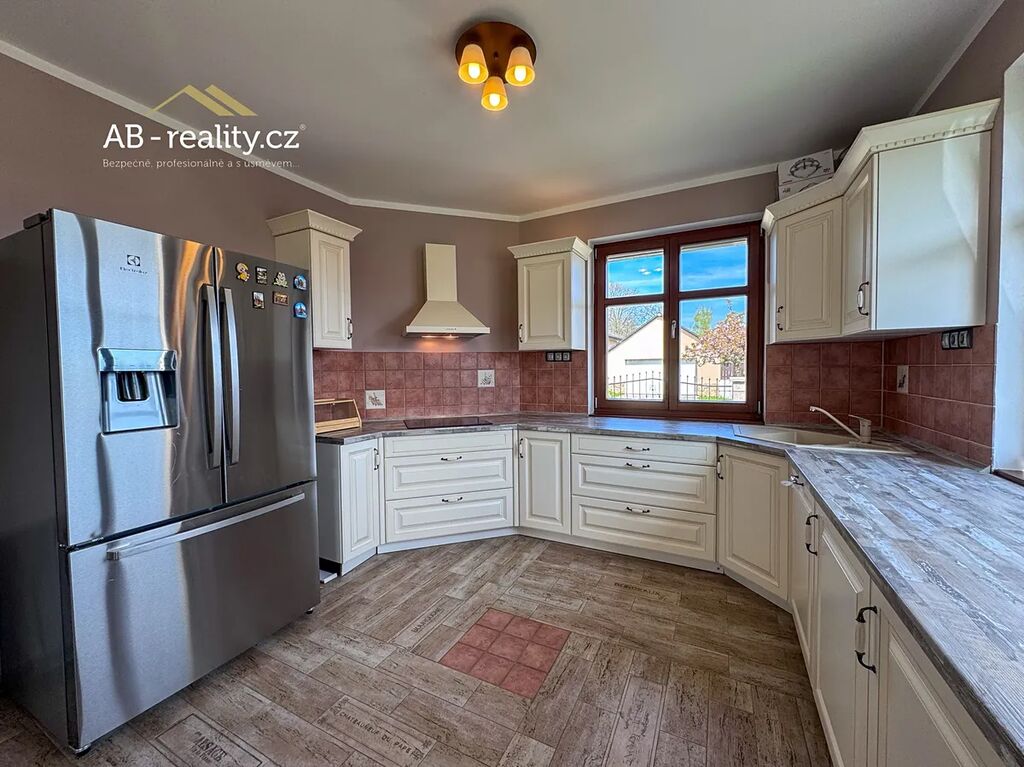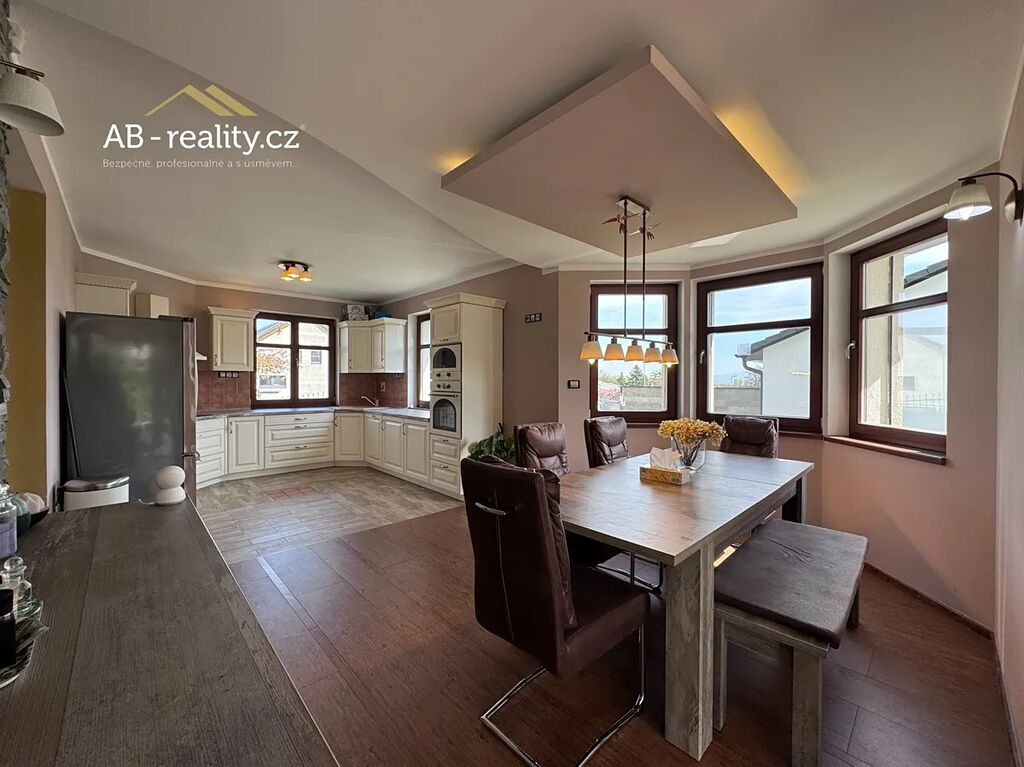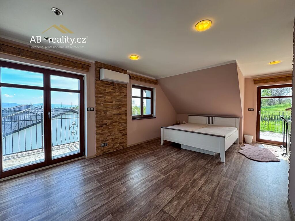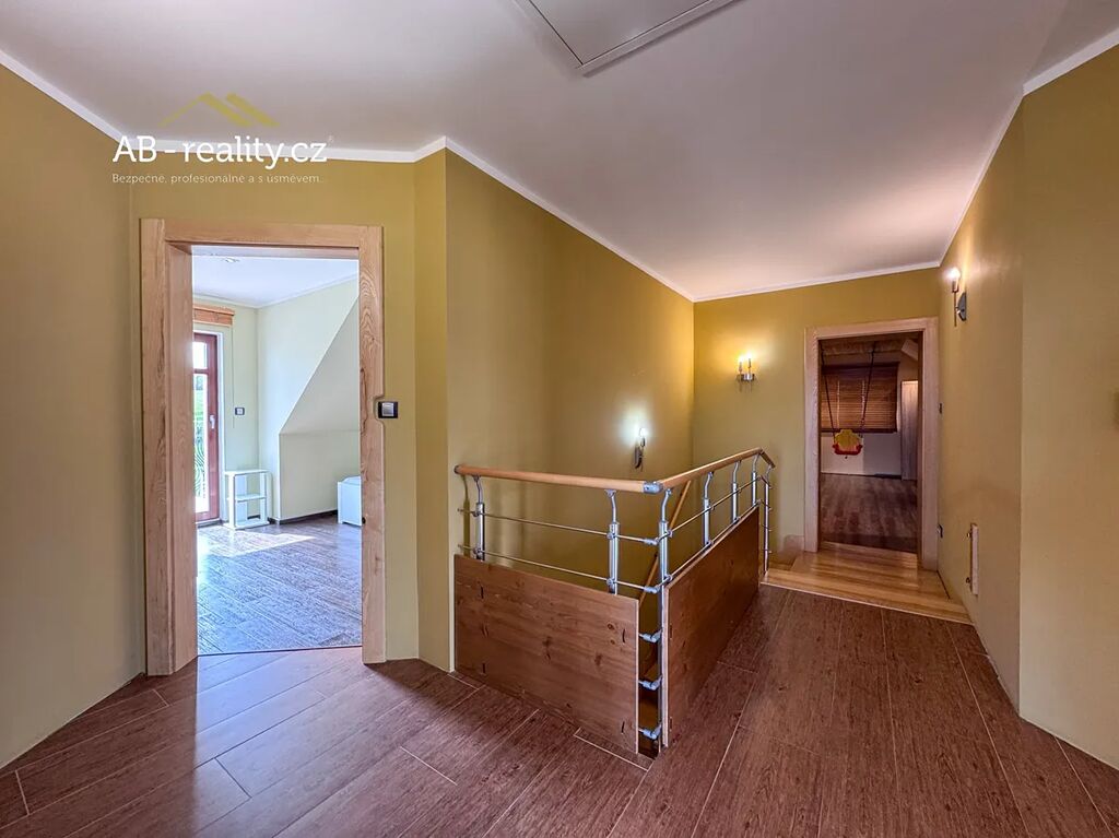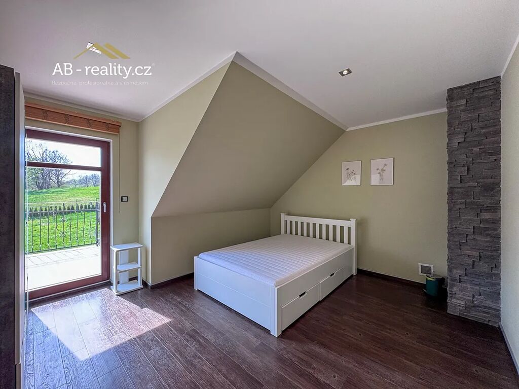 I. NP – hlavní vstup do domu se zádveřím, prostorná obývací hala s krbem a dvěma vstupy na terasu, kuchyň s jídelnou, koupelna, samostatné WC, menší sklad. Dále druhý samostatný vchod do domu se vstupní chodbou, ložnicí a koupelnou. II. NP – 4 x ložnice s terasou, koupelna. Ložnice situovaná na jižní stranu je vybavena klimatizací. III. NP podkroví – jedna velká prostorná ložnice (26m2). Všechny místnosti domu působí velmi vzdušně a nabízejí dostatek prostoru a soukromí. Dům je posazen na vlastním udržovaném pozemku s celkovou plochou 2015 m2. Na zahradě je samostatně stojící prostorná garáž pro dva vozy. Místo pro parkování dalších vozů je připraveno na vlastním pozemku u domu. Celkový technický stav celého objektu je velice dobrý i díky skutečnosti, že dům byl původními majiteli málo využívaný. Nutno vidět. Otop vody zajišťuje elektro kotel a tepelné čerpadlo, ve velké části domu je instalováno podlahové vytápění. Ohřev vody zajišťuje elektrický boiler. Jedná se o příjemné a ničím nerušené bydlení v klidné lokalitě na úpatí Krušných hor. Dojezd do Teplic 10 km, napojení na D8 25 km.