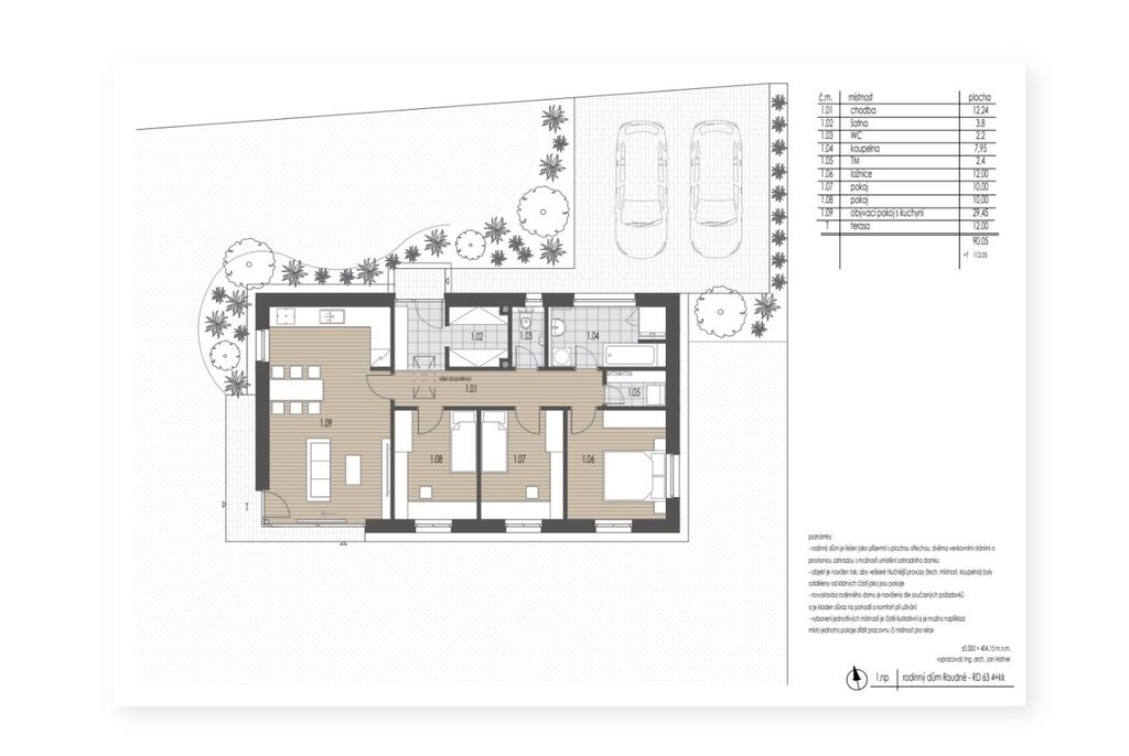 Obytná plocha domu je 90,05m2. Zastavěná plocha domu 112,50m2 + parkovací stání pro 2 auta cca 36m2+ terasa o výměře 12m2.