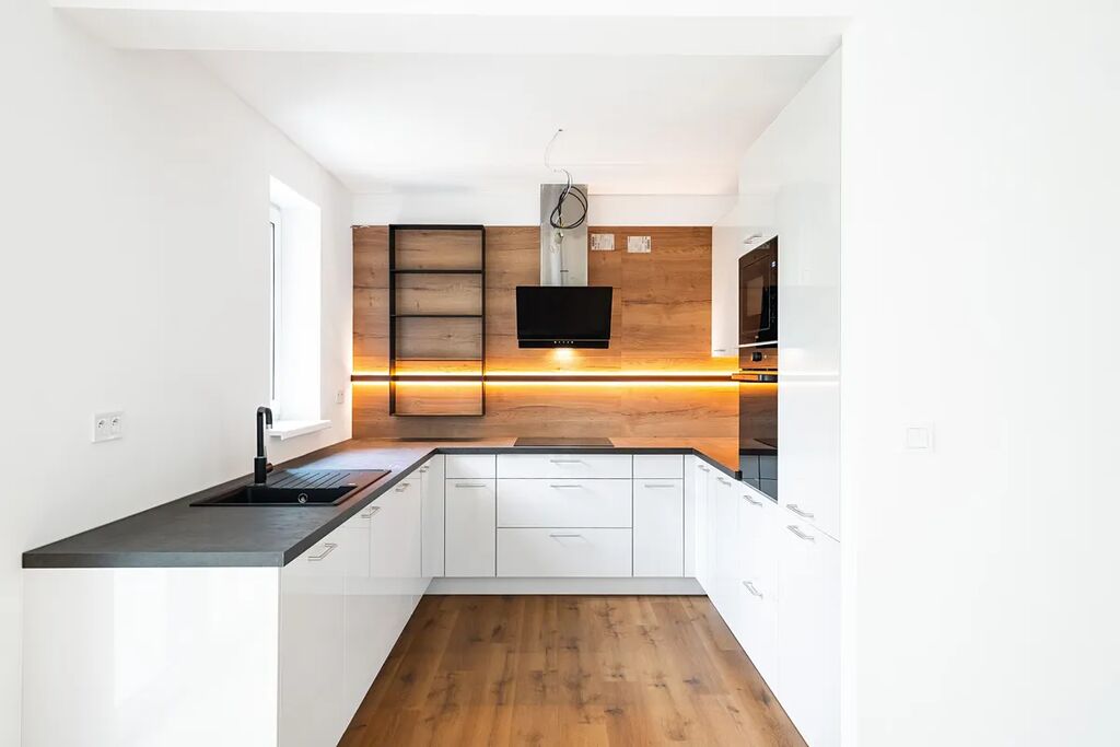 Prostorný obývací pokoj s velkou moderní kuchyňskou linkou a přímým vstupem na terasu, která obklopuje téměř celý dům. Prezentujeme kuchyni z domu C a dům C, který je již pronajatý. Aktuální dům B a kuchyně bude inzerována po její instalaci začátkem prosince 2025. Domy jsou postavené ve stejném standardu.