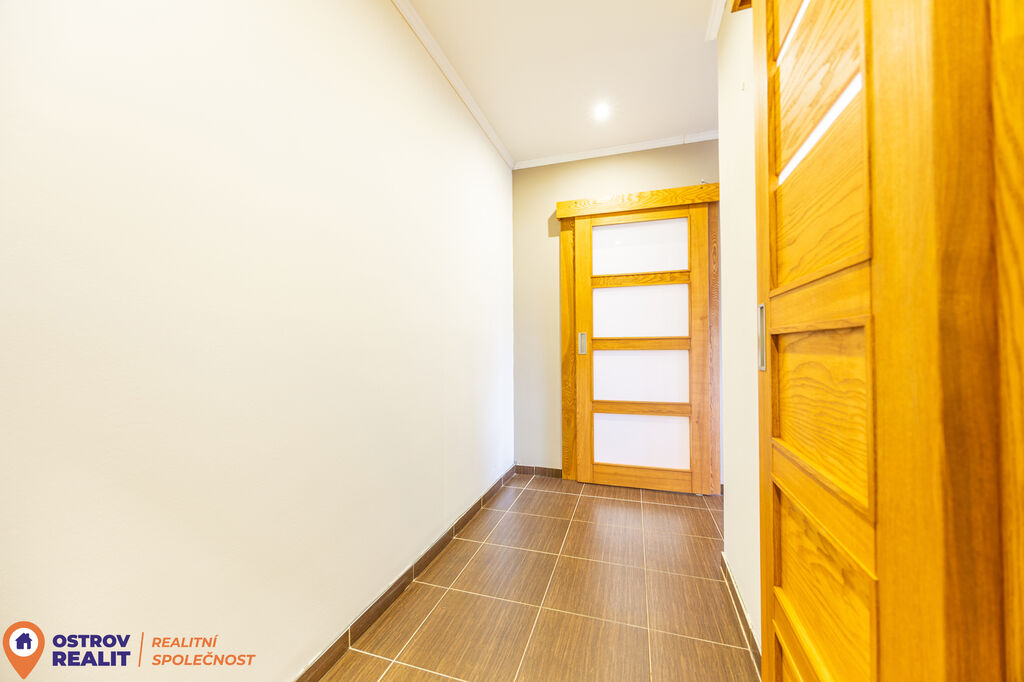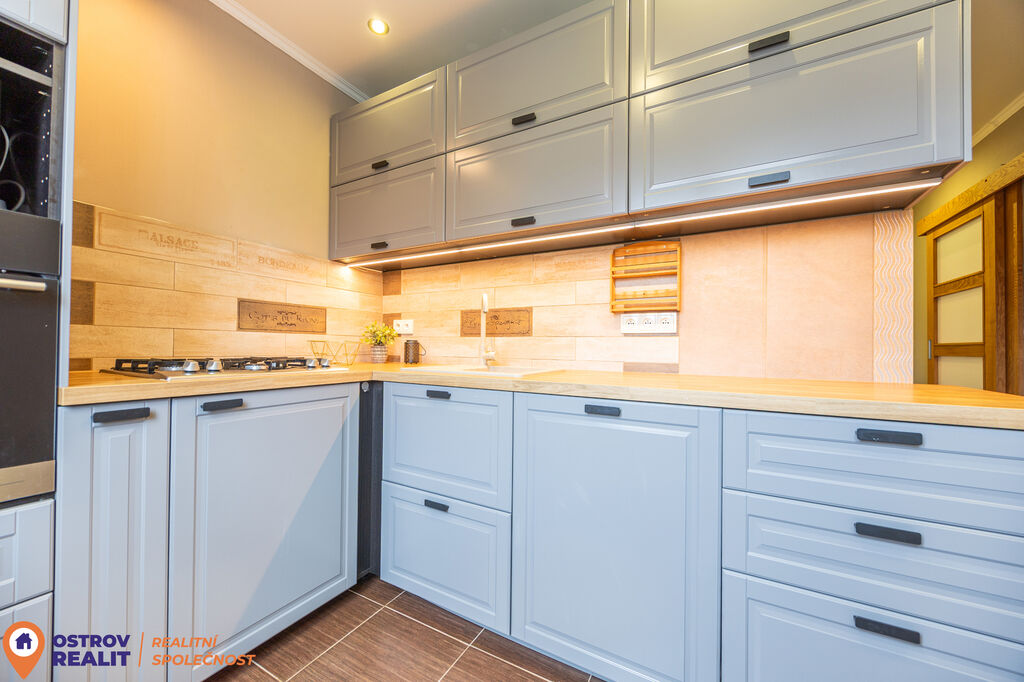 Velkým benefitem bytu jsou zcela nové posuvné dveře z masivu, které skvěle doplňují interiér a dodávají mu nadčasový vzhled. Kuchyň je vybavena novou kuchyňskou linkou, a tak je připravena k okamžitému užívání bez dalších investic.