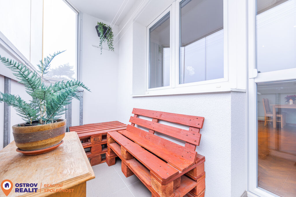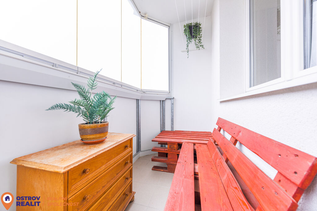 K bytu náleží zasklená lodžie orientovaná na jih, která poskytuje dostatek slunce a příjemné místo k posezení po celý den.