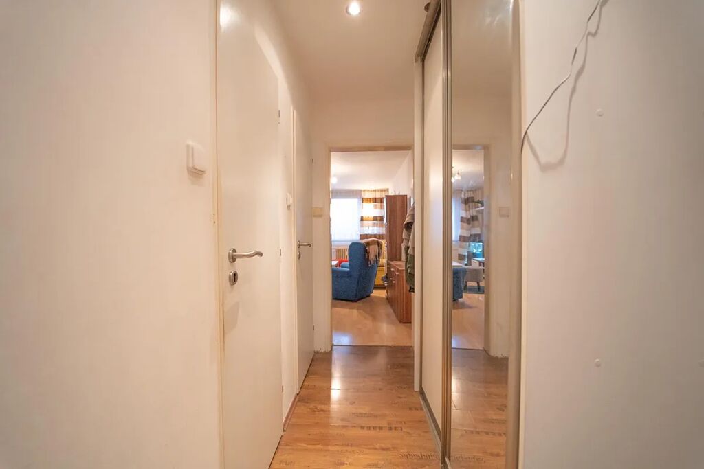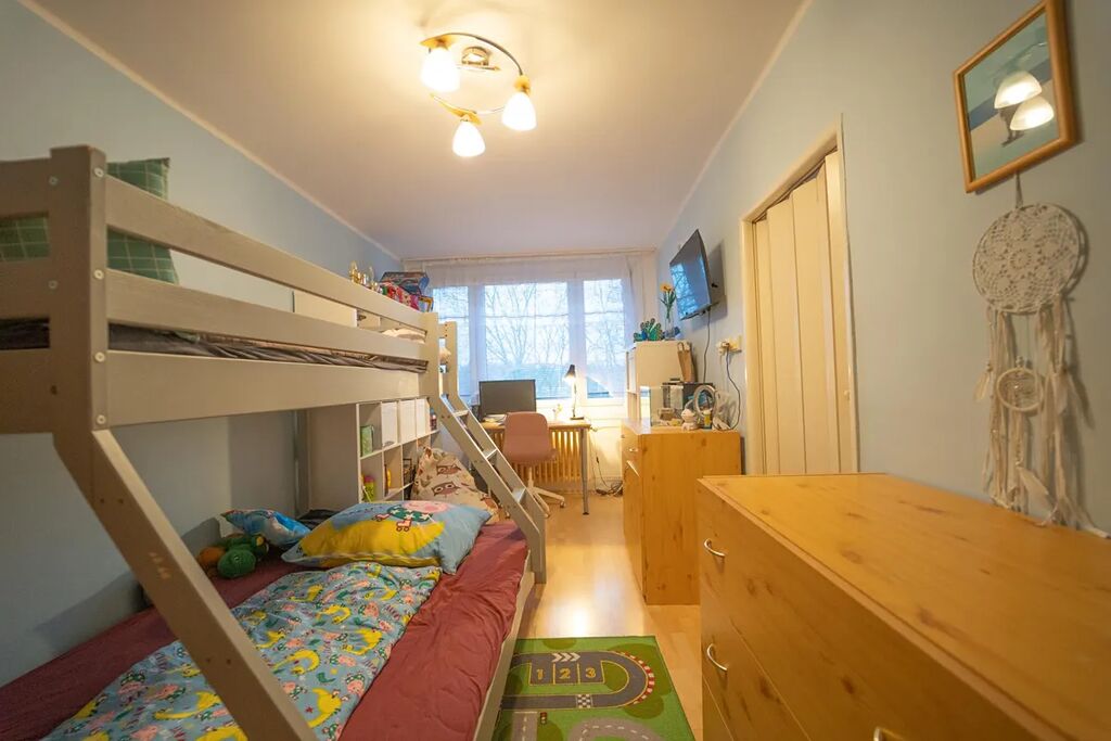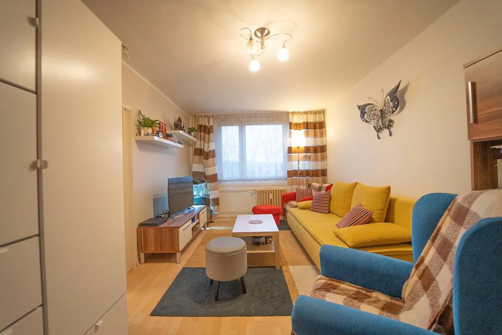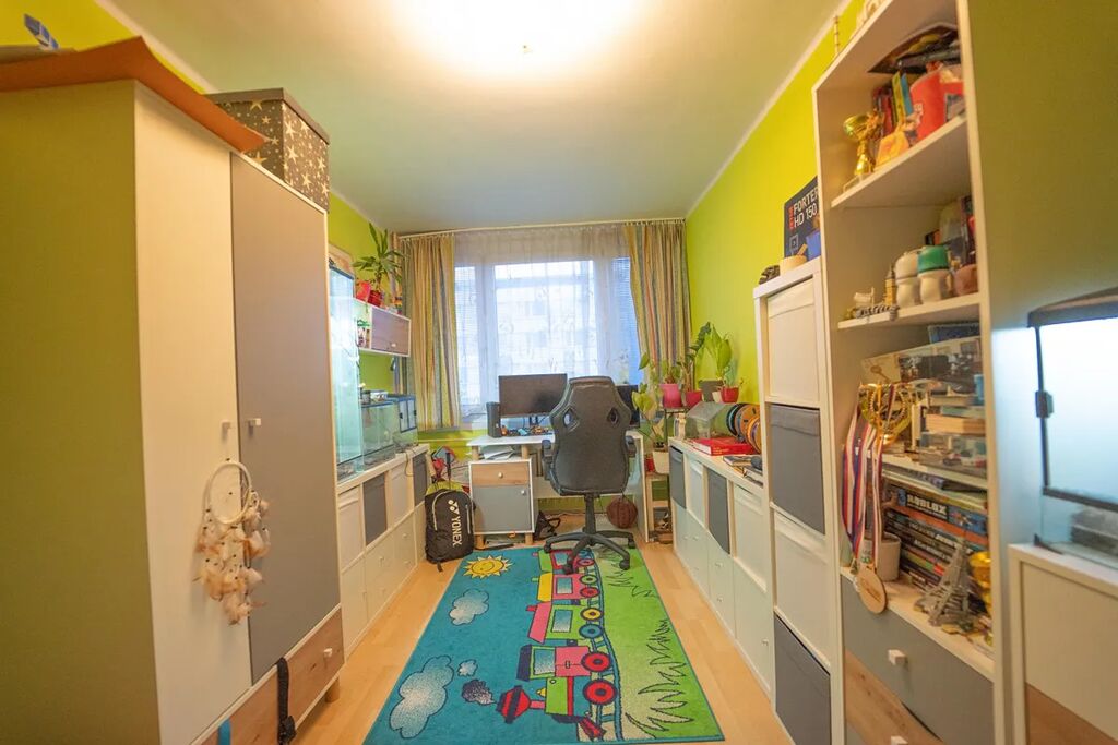 Dispozice zahrnuje vstupní chodbu, obývací pokoj, kuchyň, ložnici, dětský pokoj, koupelnu se sprchovým koutem a samostatné WC. Byt prošel částečnou rekonstrukcí, má zděné jádro a podlahovou krytinu tvoří plovoucí podlaha a dlažba. K bytu náleží také sklepní kóje umístěná v suterénu domu.