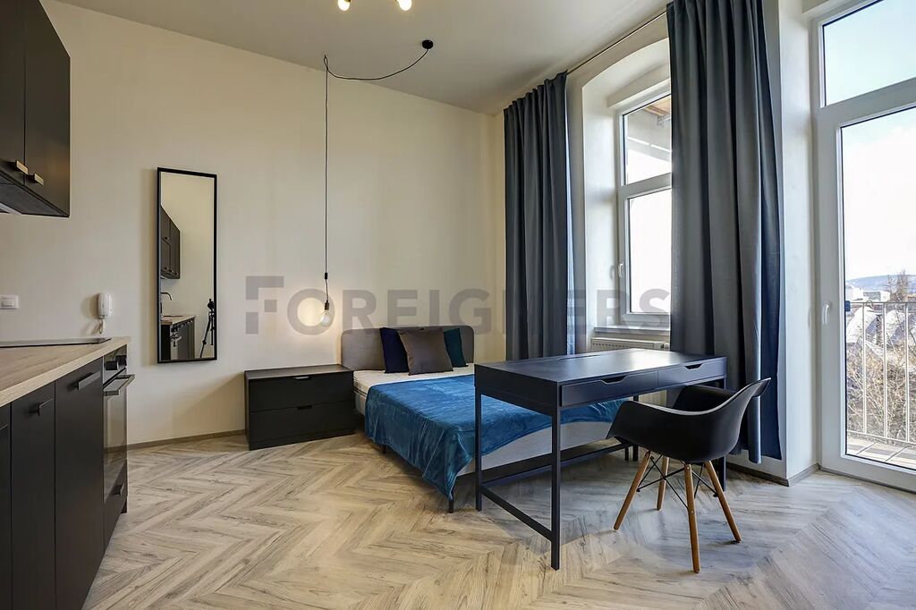Byt je vybaven vestavěnou kuchyňskou linkou, skříněmi, pracovním stolem s židlí. Další část pokoje bude určena pro odpočinek a je tedy vybavena postelí. Pračka a myčka je součástí vybavení.