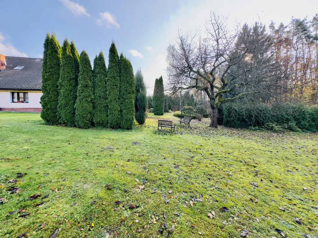 Rozlehlá zahrada o výměře 2 776 m nabízí vzrostlé stromy a okrasné keře, altánek, nový dřevěný skleník, vlastní lesík a okrasný rybníček se skalkou a molem.