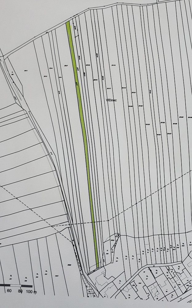 Pozemek - orná půda, p.č. 251/8, k.ú. Proseč u Březiny, obec Březina, okr. Brno - venkov (dříve Blansko), výměra 2240 m². Šířka 3-6 m, délka cca 440 m.