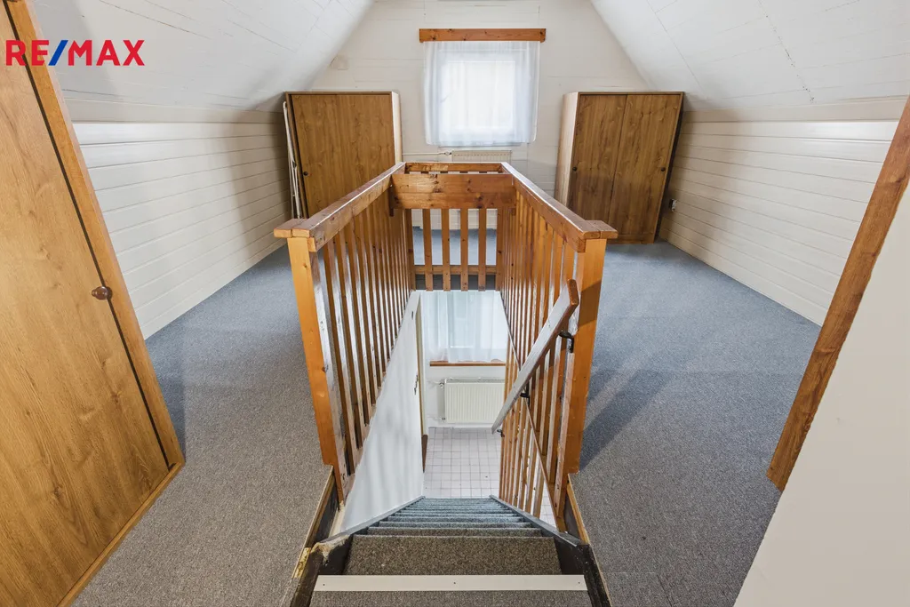 V patře se nachází jeden větší pokoj a menší mezipokoj. K dispozici je Vám také sklep, který se hodí pro uložení potravin nebo třeba i Vaší vinné sbírky.