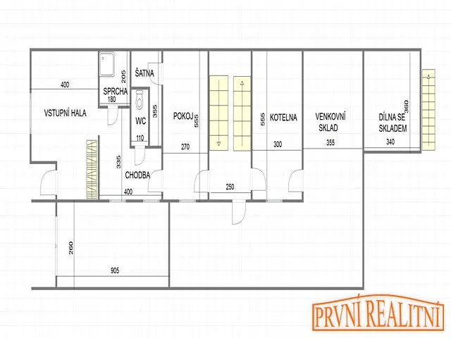 přízemí – vstupní hala, chodba, koupelna se sprchou, WC, pokoj se šatnou, schodiště, kotelna, závětří - venkovní sklad a vnitřní sklad s dílnou