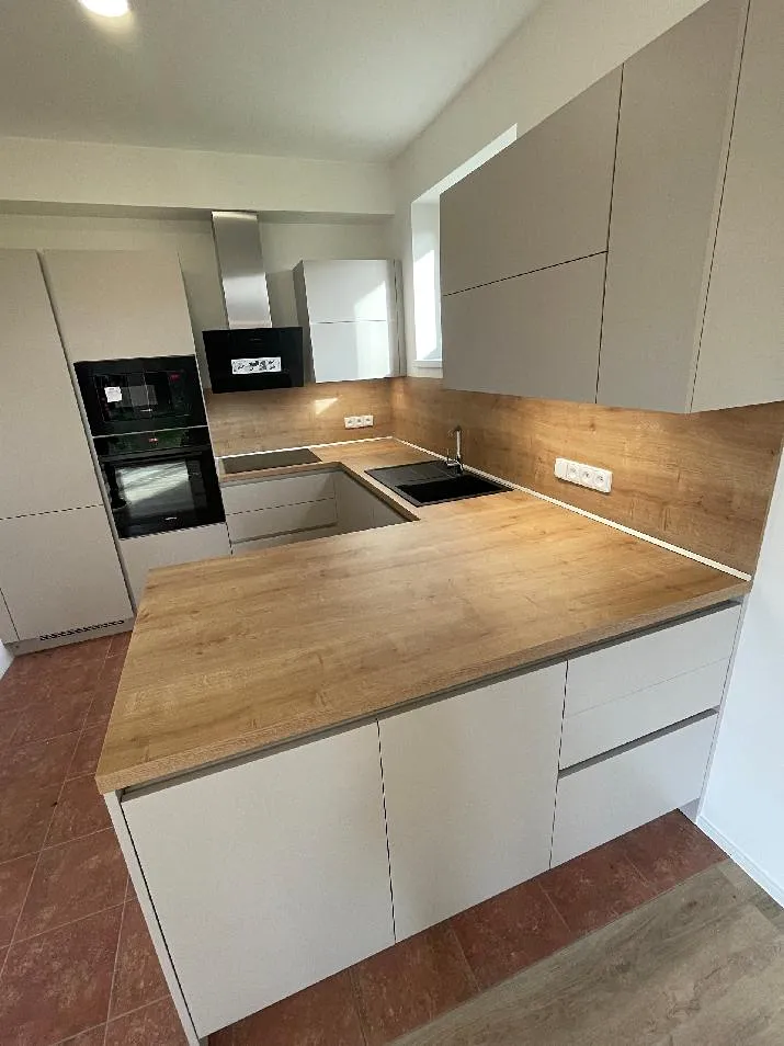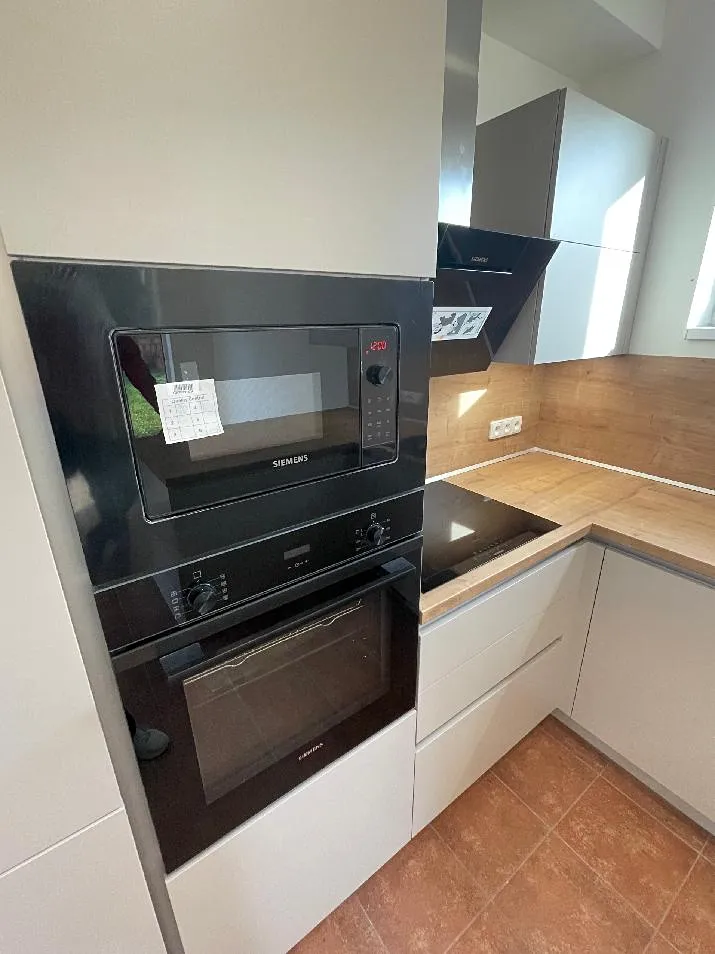Kuchyňská linka je vybavena vestavěnými moderními spotřebiči, součástí vybavení je i osvětlení s funkcí regulace intenzity svícení.