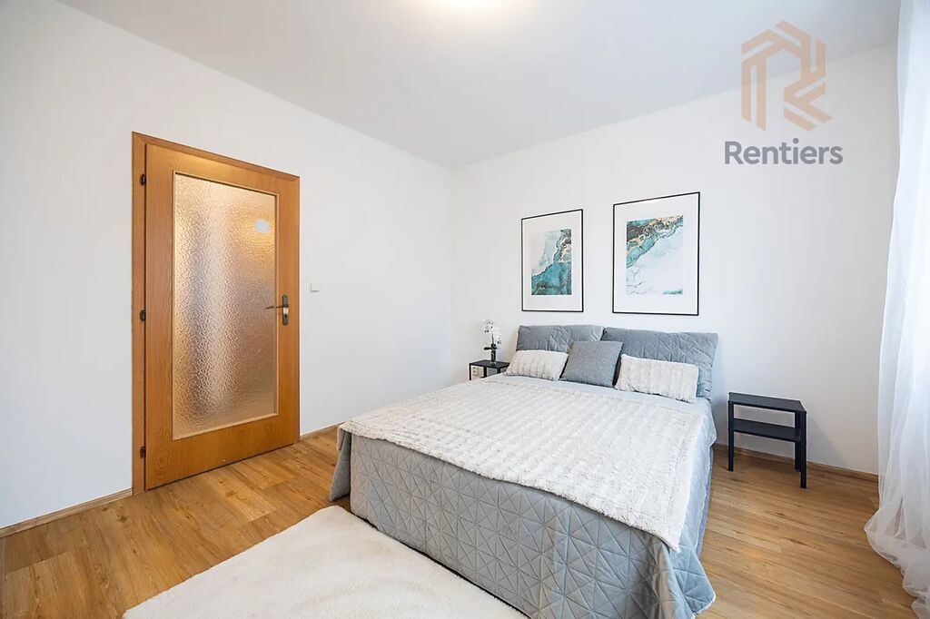 Byt je velmi dobře dispozičně řešen. Nabízí světlý obývací pokoj se vstupem na balkon, samostatnou kuchyň s jídelním koutem, tři ložnice orientované na jih a západ, prostornou koupelnu s vanou a samostatné WC, a další koupelnu se sprchovým koutem a WC a celkově tak dostatek úložných prostor, včetně sklepa.