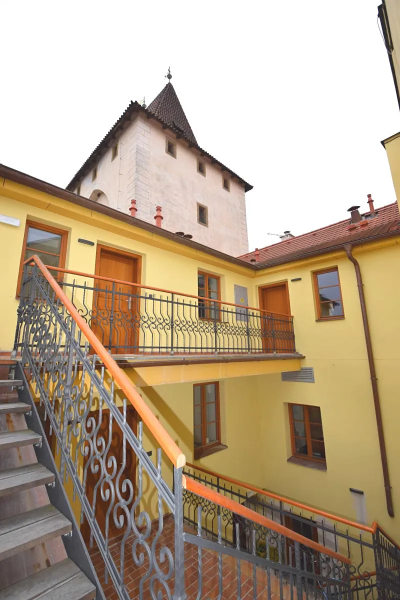 - příjemná společná pavlač (9 m2) pro dva byty s výhledem na historické centrum
